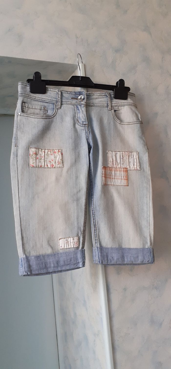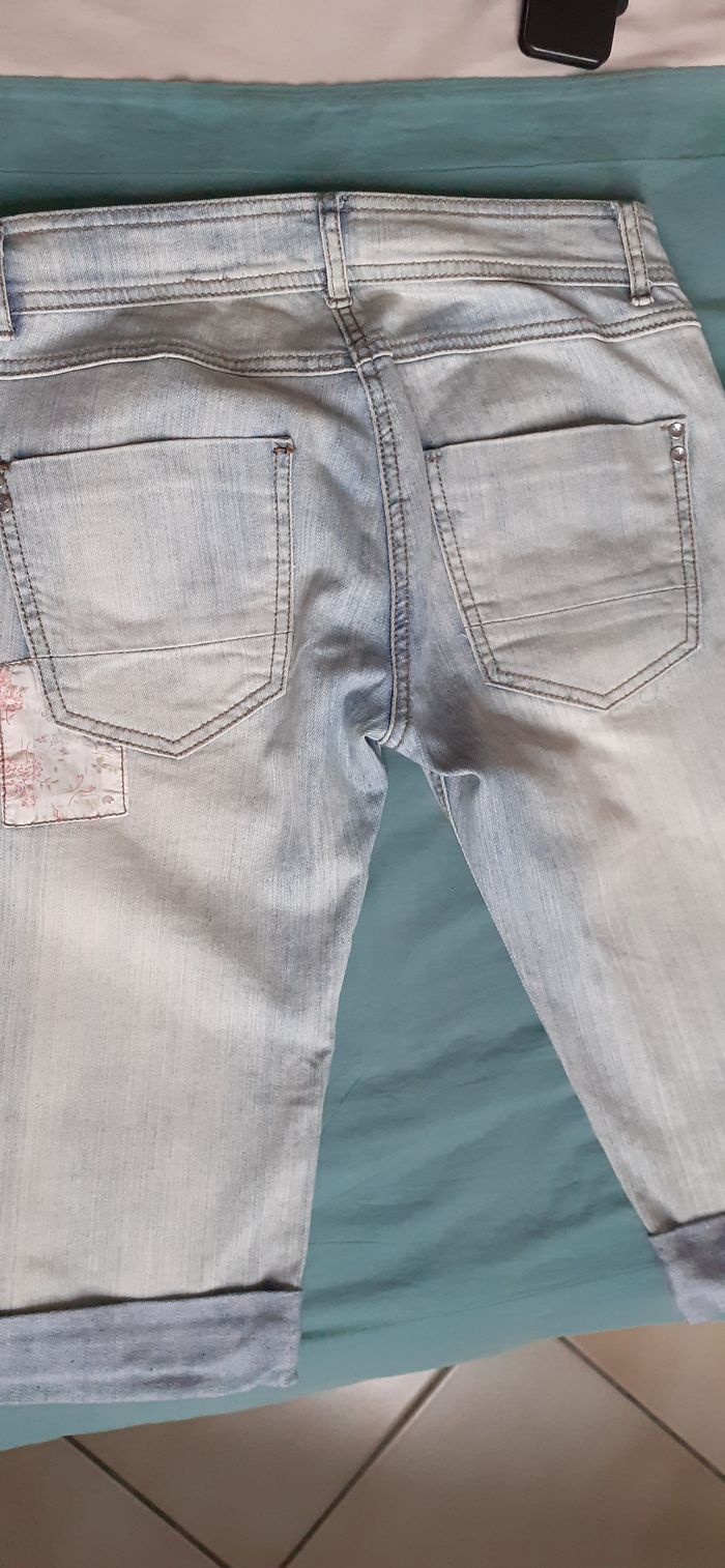 Vends un short long à revers, 98 % coton, 2 % élasthanne aspect jean bleu délavé, empiècements et intérieur de la ceinture fleuris, marque Rosebud de Gémo, taille 38. Longueur sur le côté : 54 cm Largeur de la ceinture à plat : 38 cm.