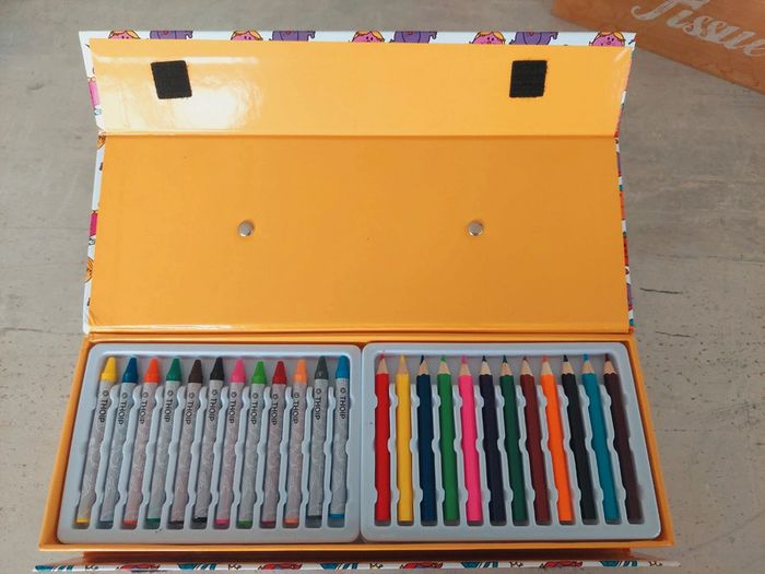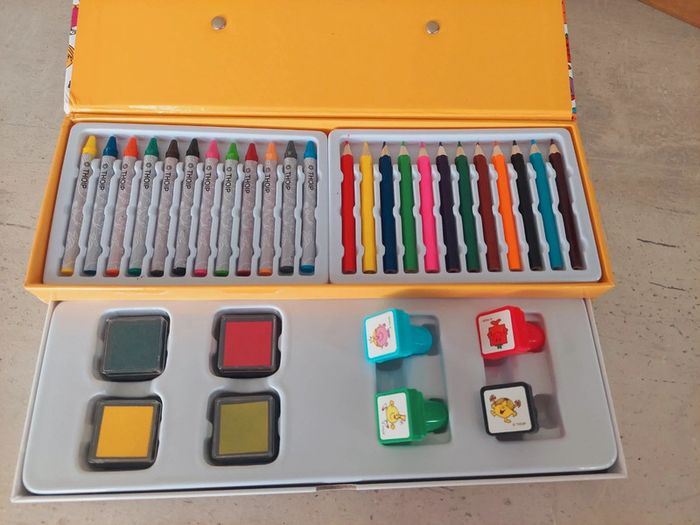 📖 Malette de coloriage composé de 12 crayons de couleur, 12 craies grasses, 4 encreurs et 4 tampons à l'effigie de Monsieur Madame.