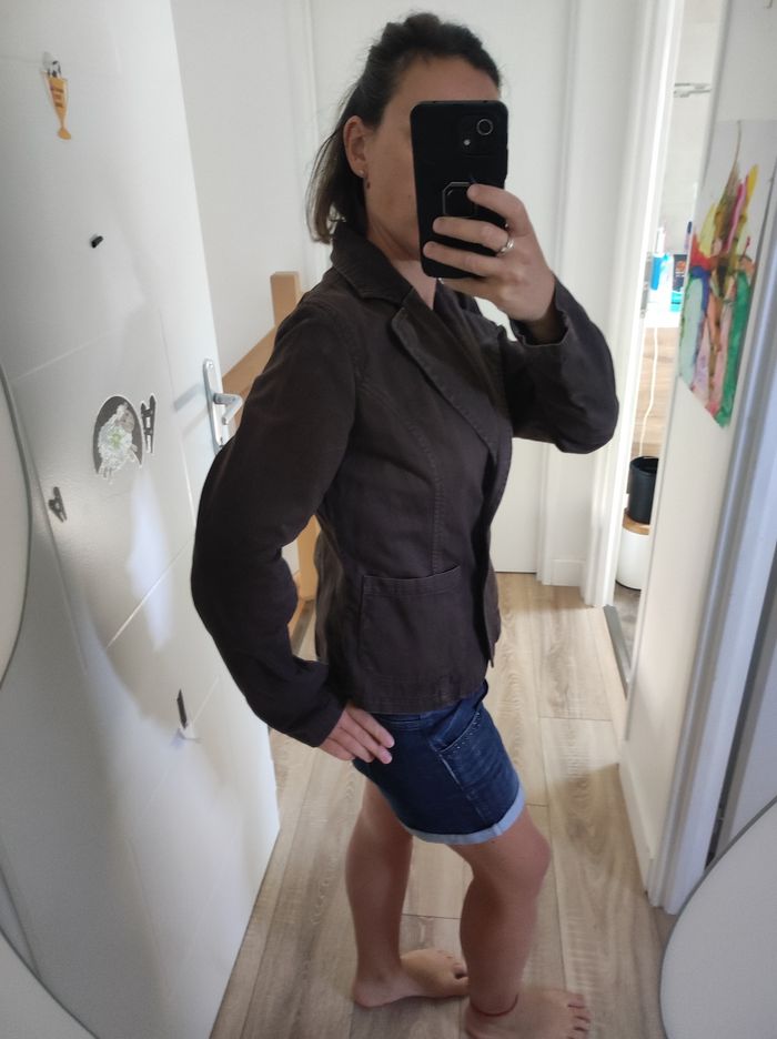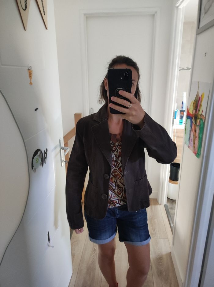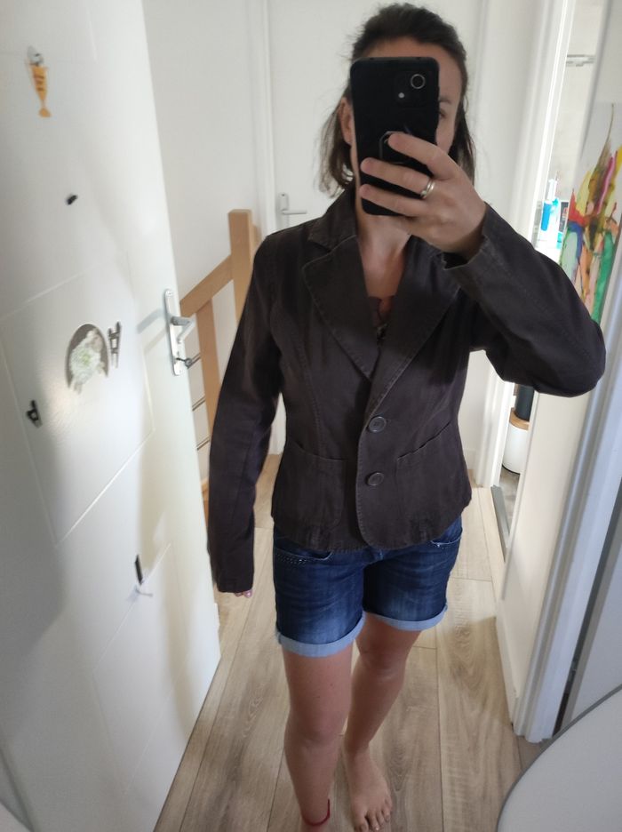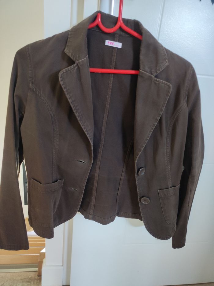 Veste en coton de couleur marron un peu plus clair par endroit du fait d'avoir été portée et lavée plusieurs fois mais en très bon état. Peut se porter avec une jupe , un pantalon ou même un short.