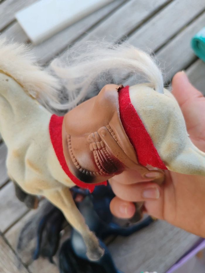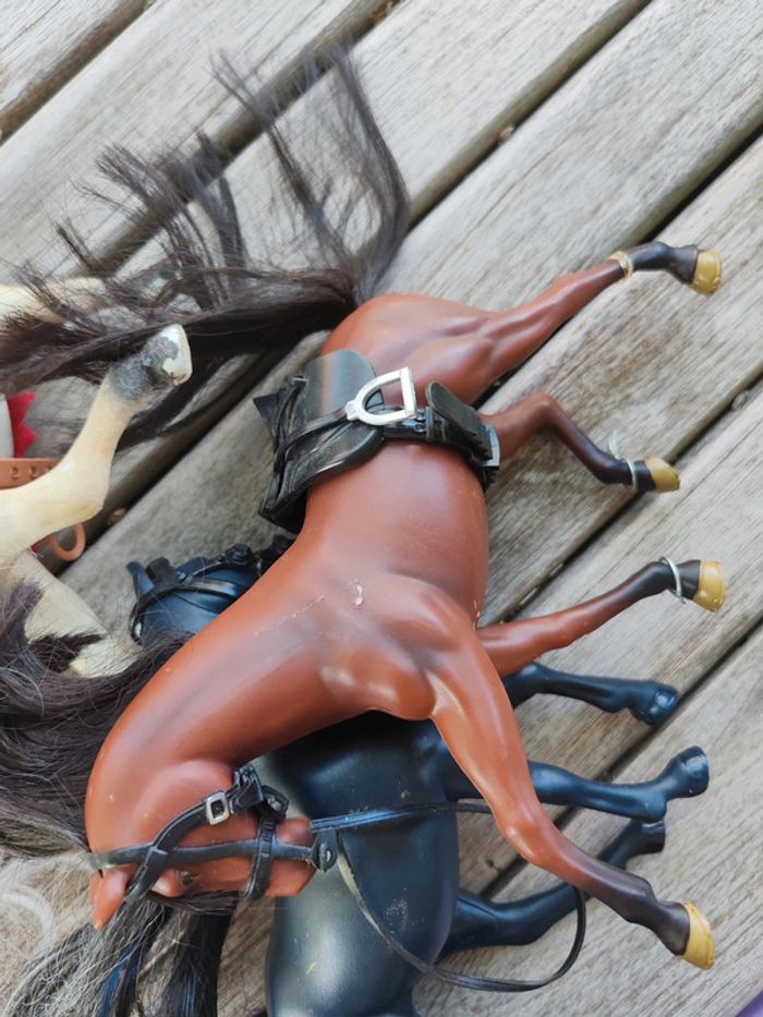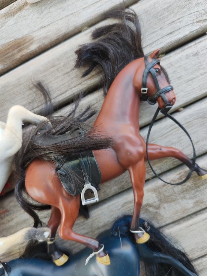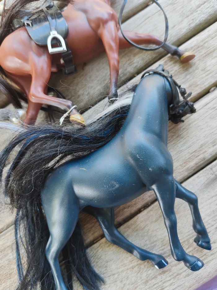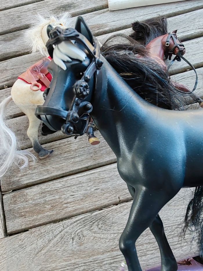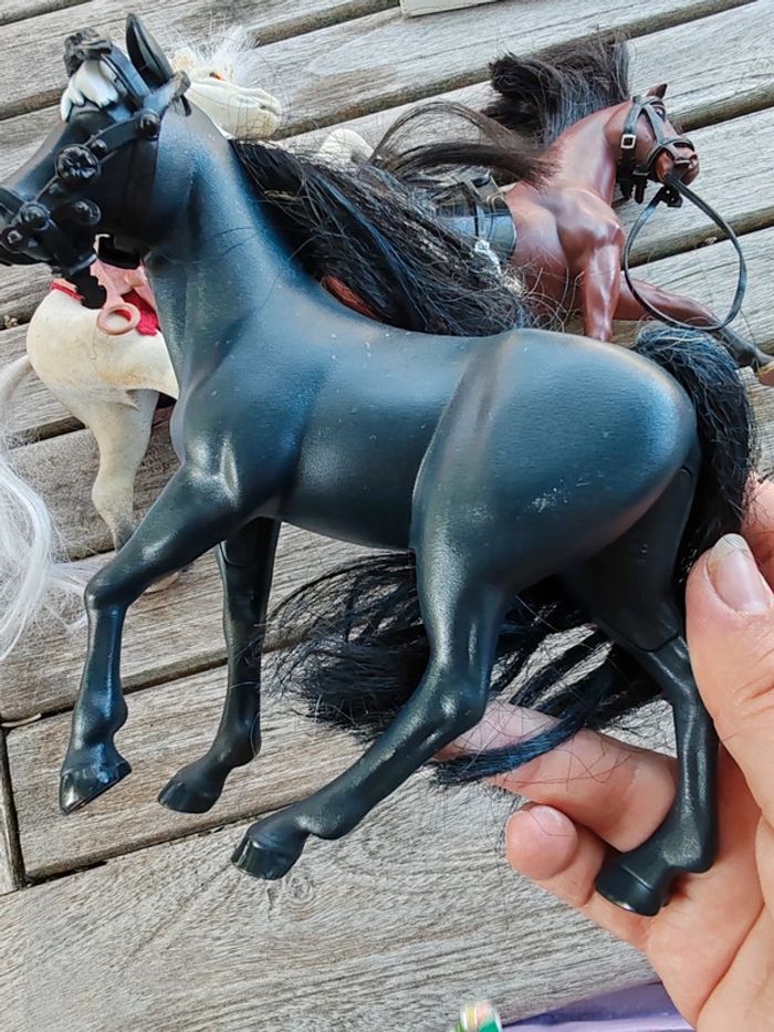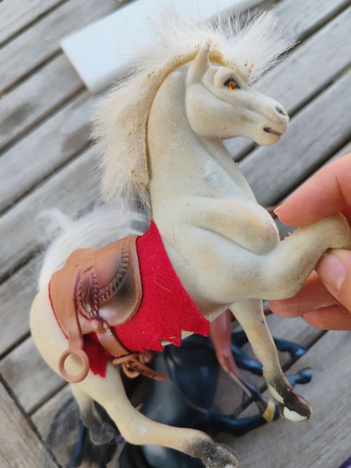 Lot de 3 figurines chevaux en plastique Un blanc avec effet duvet, un noir et un marron Ils sont quelques accessoires Bon état général ➡️ #ursullabuffayfigurines