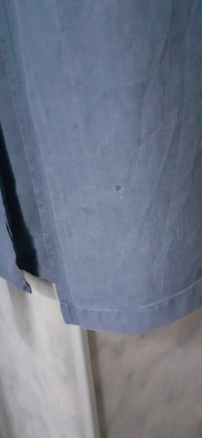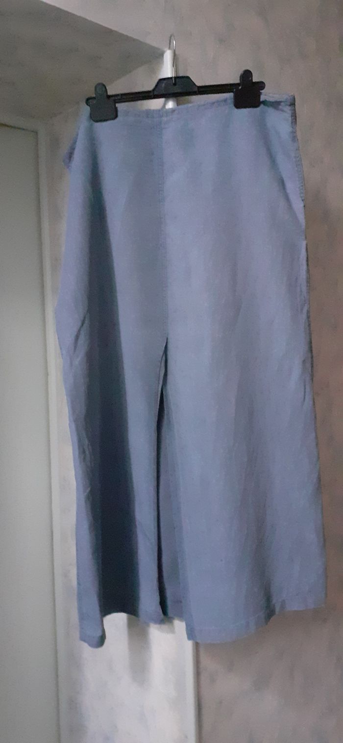 Vends une jupe longue 100% lin effet toile de jean fin et souple, fendue derrière à 44 cm de la ceinture, liens à nouer devant à l'intérieur de la ceinture, couleur bleu jean, marque Gap, taille L/G sur l'étiquette, 48-50 d'après les mesures. Longueur : 95 cm Largeur de la ceinture à plat : 51 cm Largeur au niveau des hanches : 58 cm. A noter : une petite tache sur l'arrière en bas (voir photo 3).