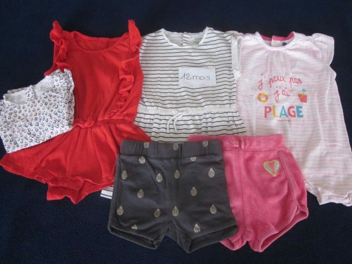 12 mois, 2 barboteuses + robe mc + 2 shorts + 3ème barbo offerte (auréole), sucre d'orge, kiabi, orchestra