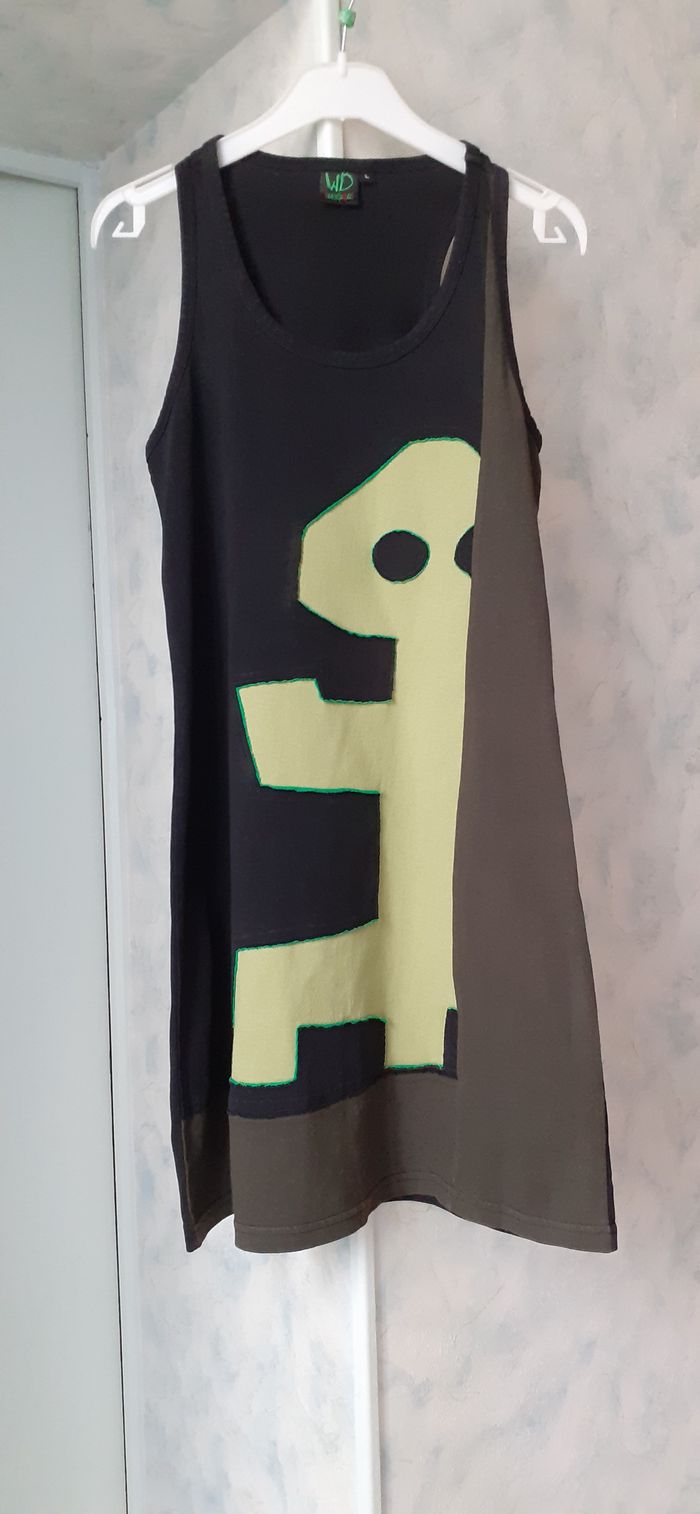 Vends une robe en coton jersey, étroite et moulante, épaules échancrées, couleur noir avec motifs vert kaki, marque WD, taille L. Longueur dans le dos : 85 cm Largeur aisselle à aisselle : 41 cm Largeur au niveau des hanches : 43 cm.