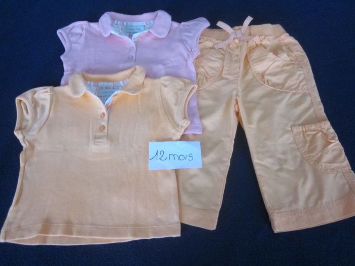 12 mois, ensemble kiabi, 2 polos mc + pantalon léger, état neuf