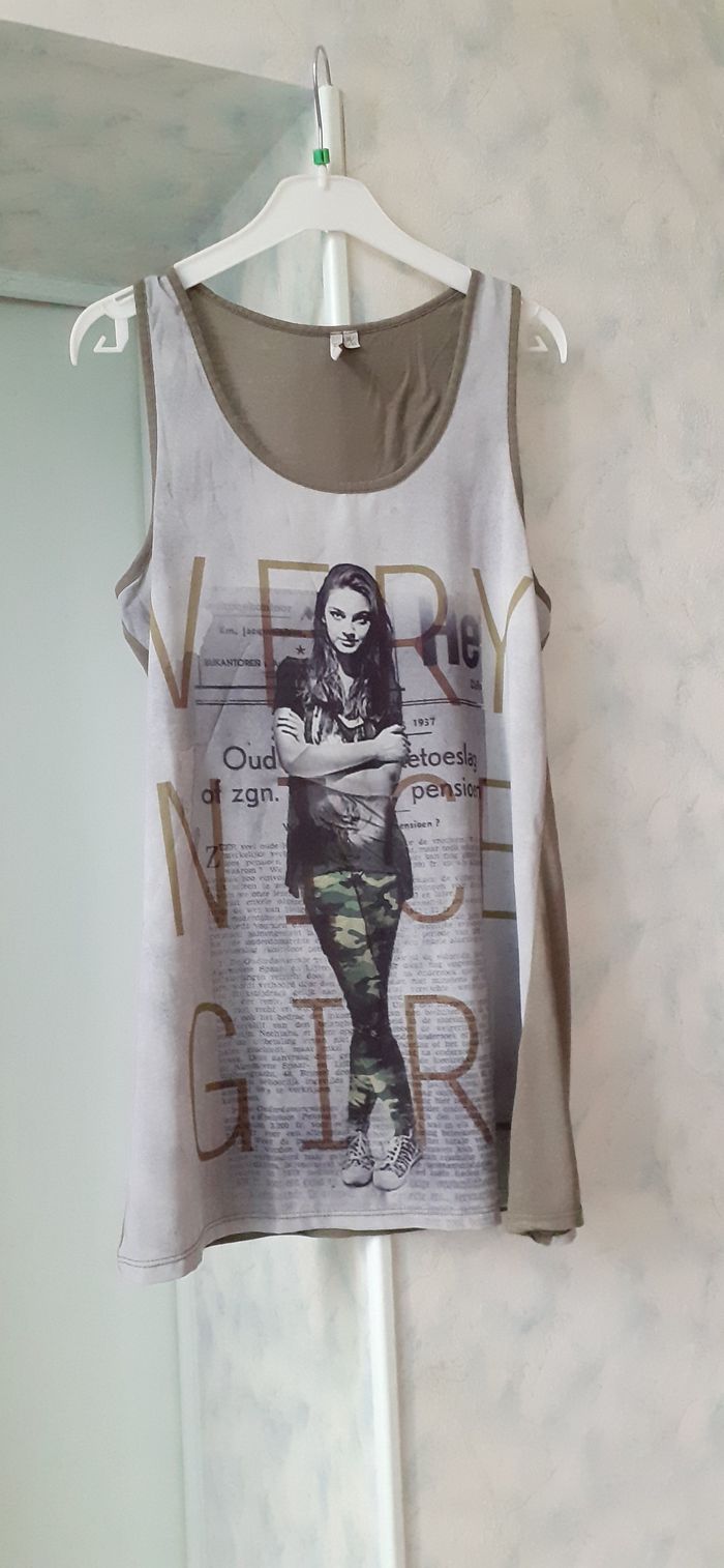 Vends un débardeur long et fin, en polyester, un peu transparent devant, couleur gris avec motifs devant et kaki uni dans le dos, marque Spot, taille 38-40. Longueur dans le dos : 69 cm Largeur aisselle à aisselle : 47 cm.