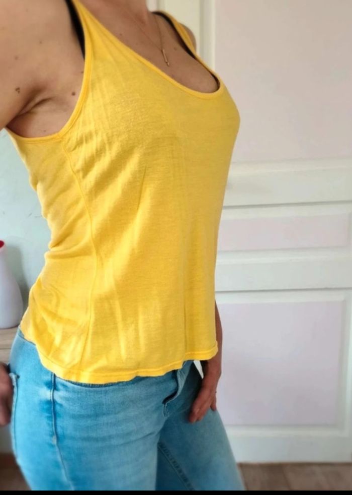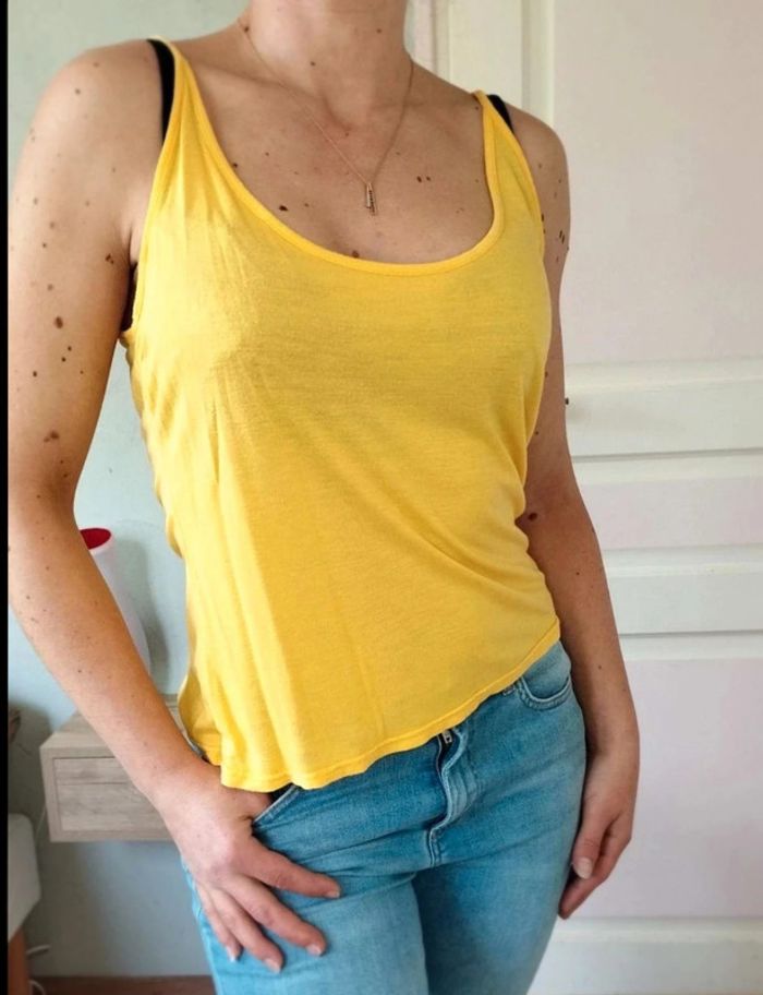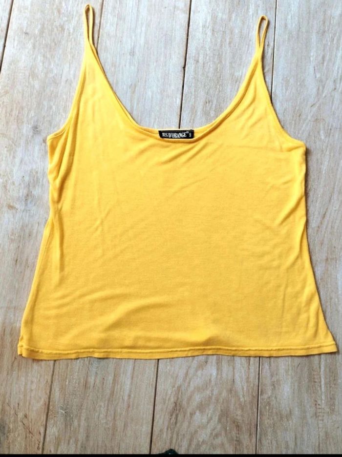 Petit débardeur Jus d'orange, taille bien pour un 34/36. Se porte ample, coton fluide, léger (et un peu transparent).