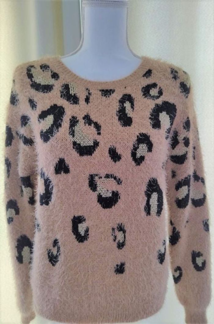 Très joli pull à poils léopard, doux. Détails fils dorés. Coupe droite, ouverture haut du dos. Taille S : taille grand ( taille mannequin 38). Porté 1 fois. Parfait état.
