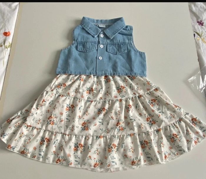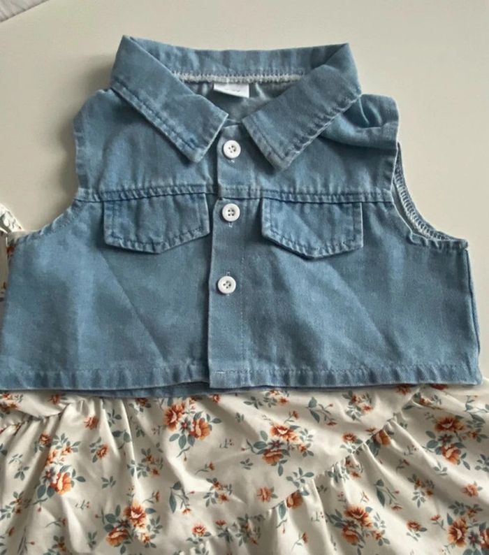 Veste en jean sans manches Robe à bretelles à fleurs Matière veste 25% polyester 60% coton 15% viscose Matière robe : polyester