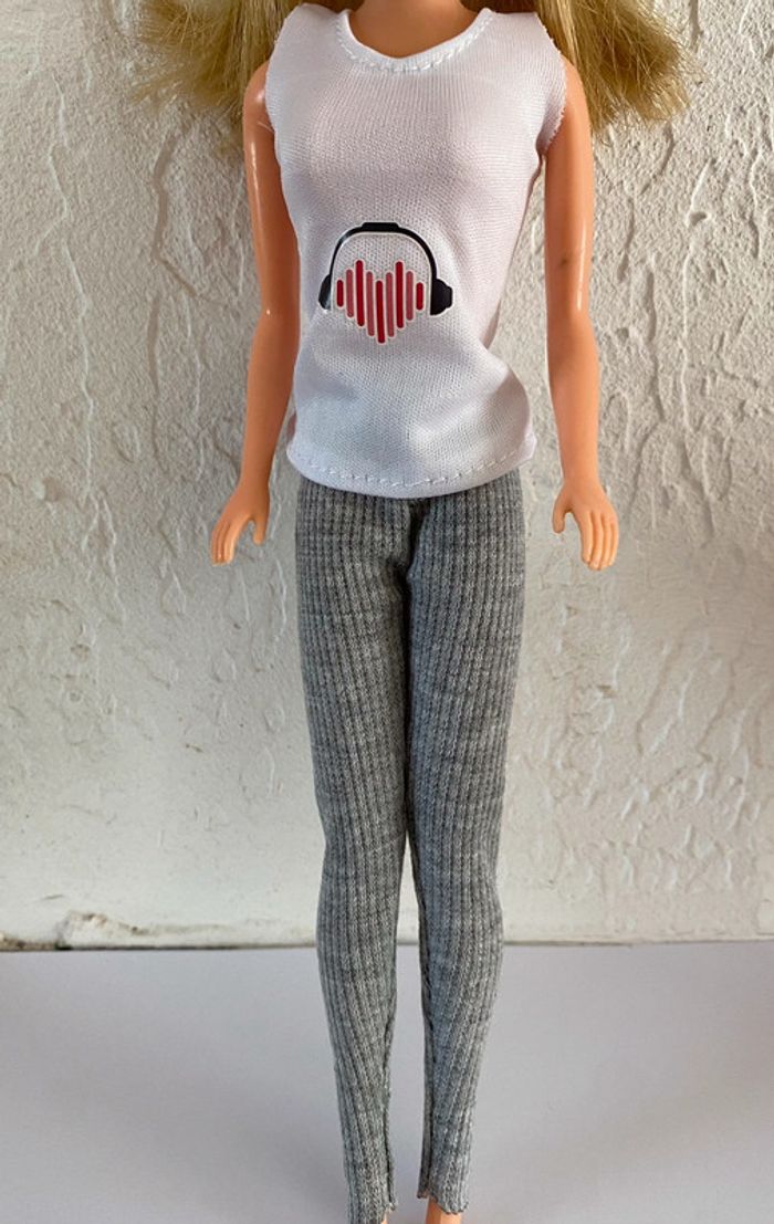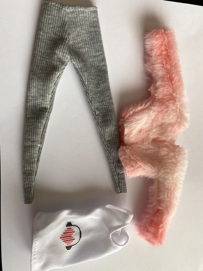 Legging gris Débardeur blanc Veste courte rose fausse fourrure