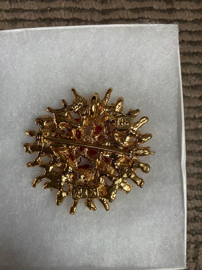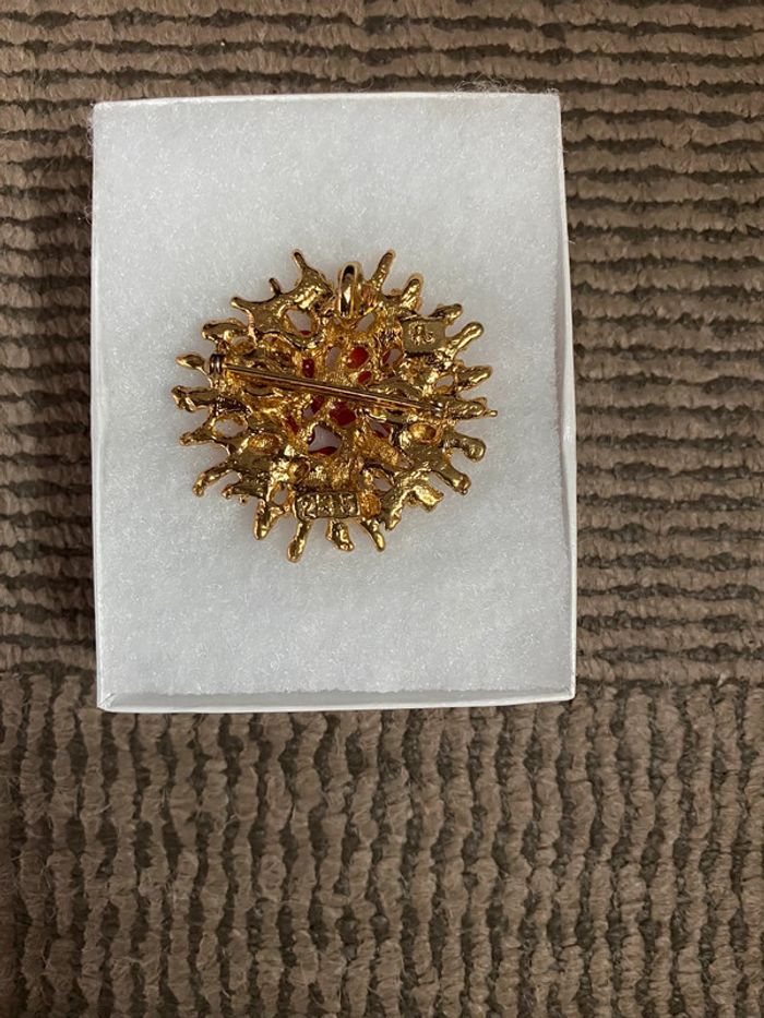 Peut être une broche ou un pendentif sur une chaîne dorée car elle dispose d’un anneau au dos
