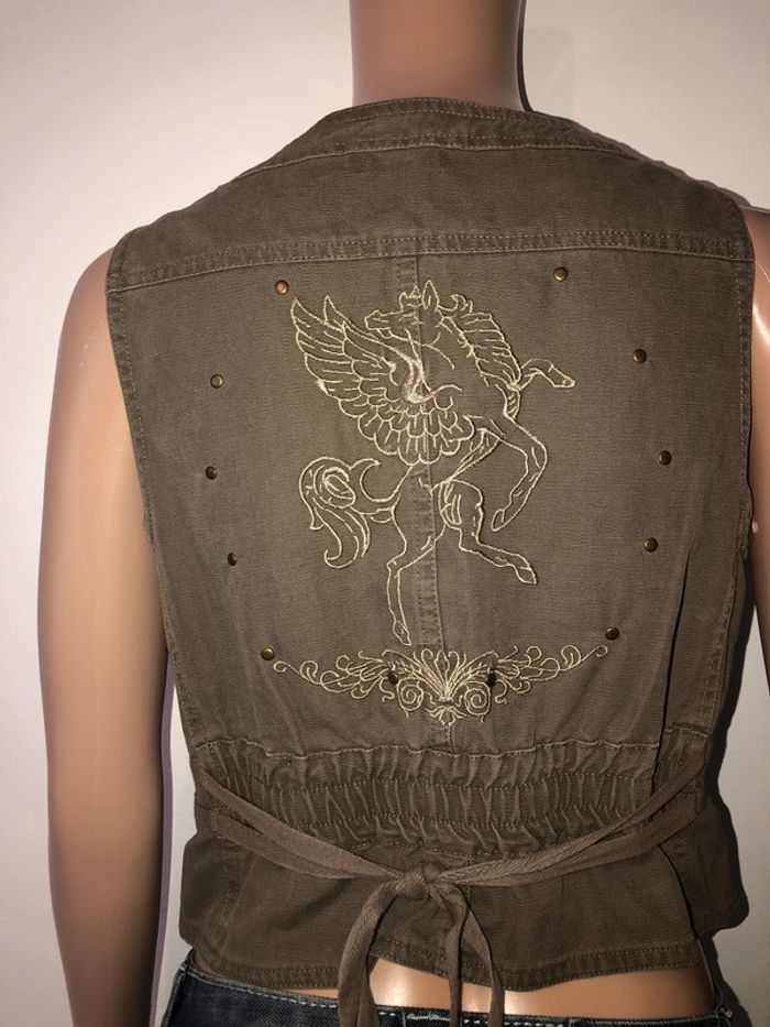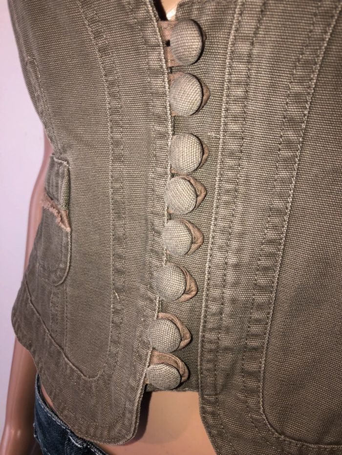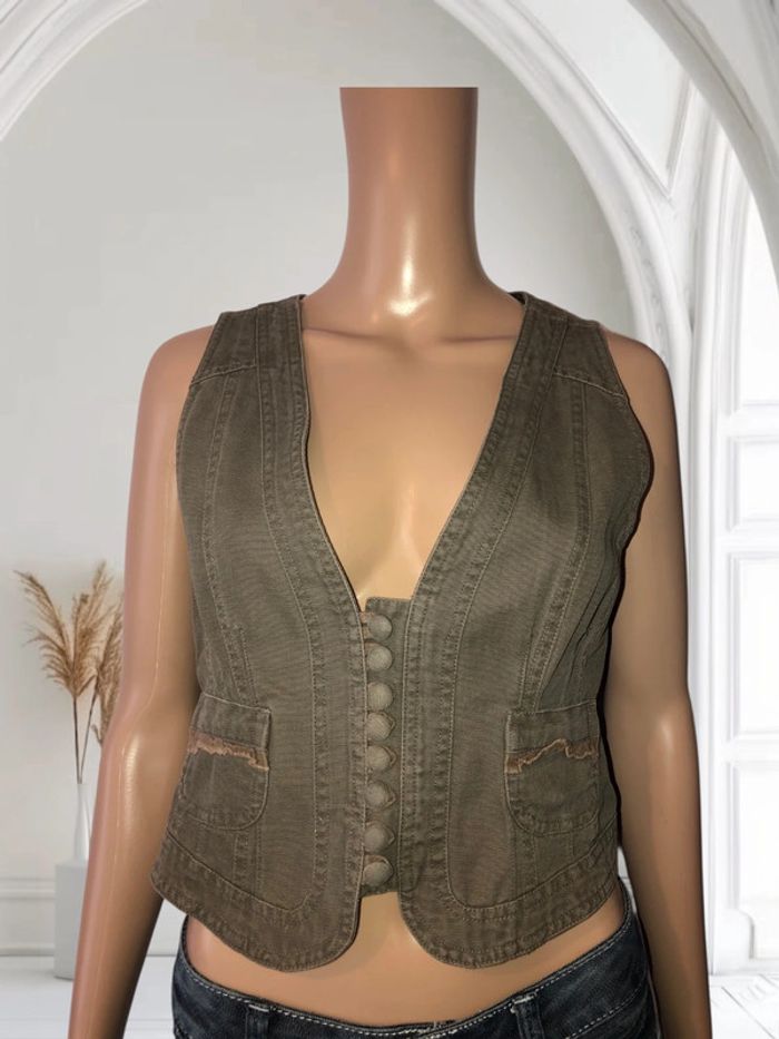 Gilet sans manches élégant, de couleur kaki avec boutons discrètes et poches. En très bon état.
