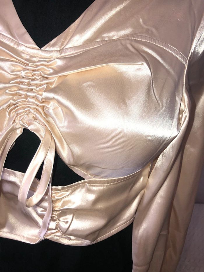 Ce haut en satin brillant avec manches longues est idéal pour une soirée élégante. Neuf, jamais porté. La taille n’est pas indiquée mais correspond à un 40