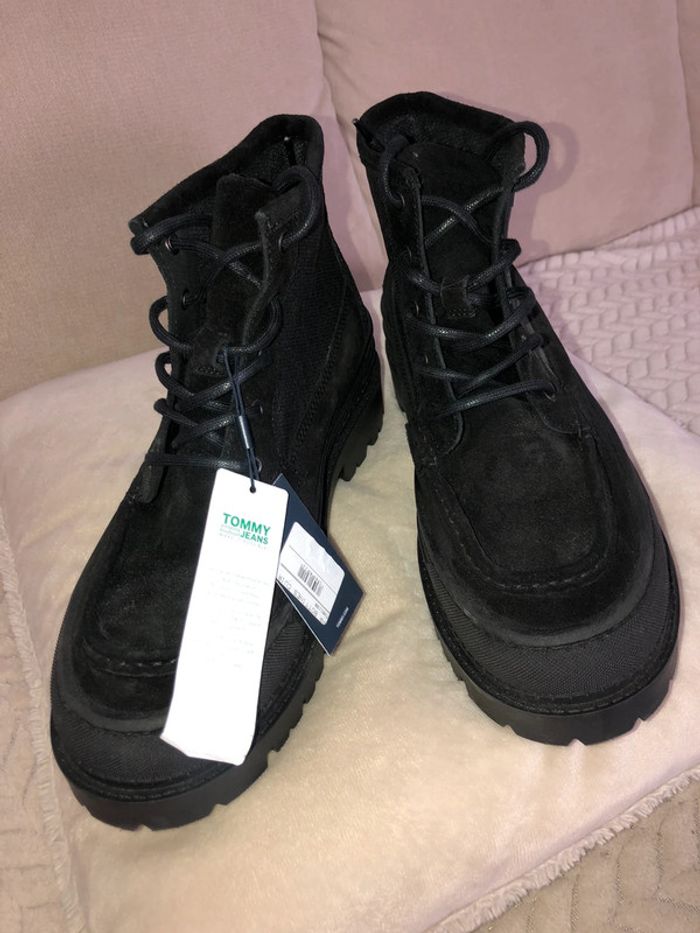 Chaussures montantes Tommy Hilfiger en cuir noir, neuves Idéales pour un look tendance et confortable.