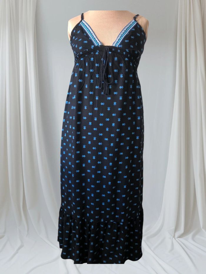 Robe d'été noire à motifs bleus, idéale pour les beaux jours.