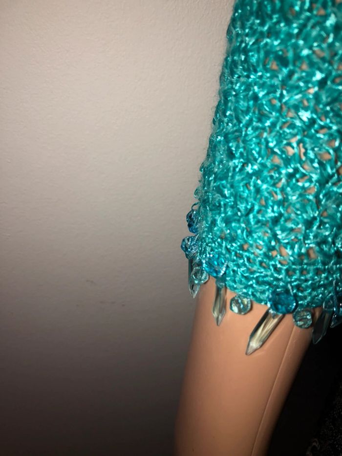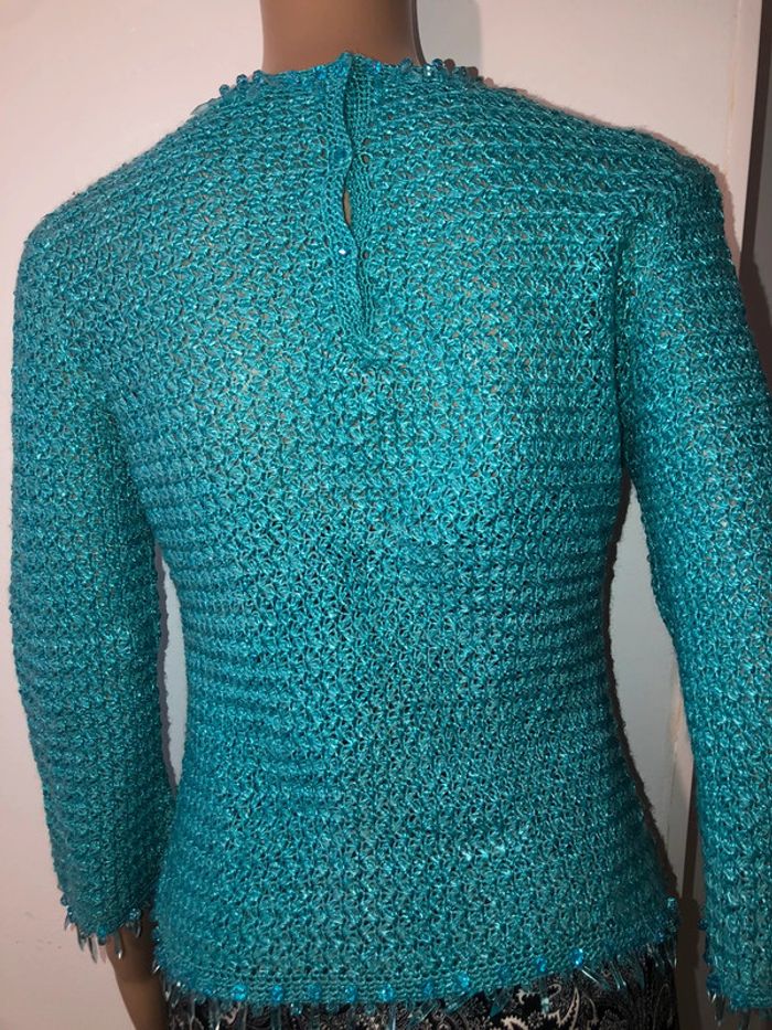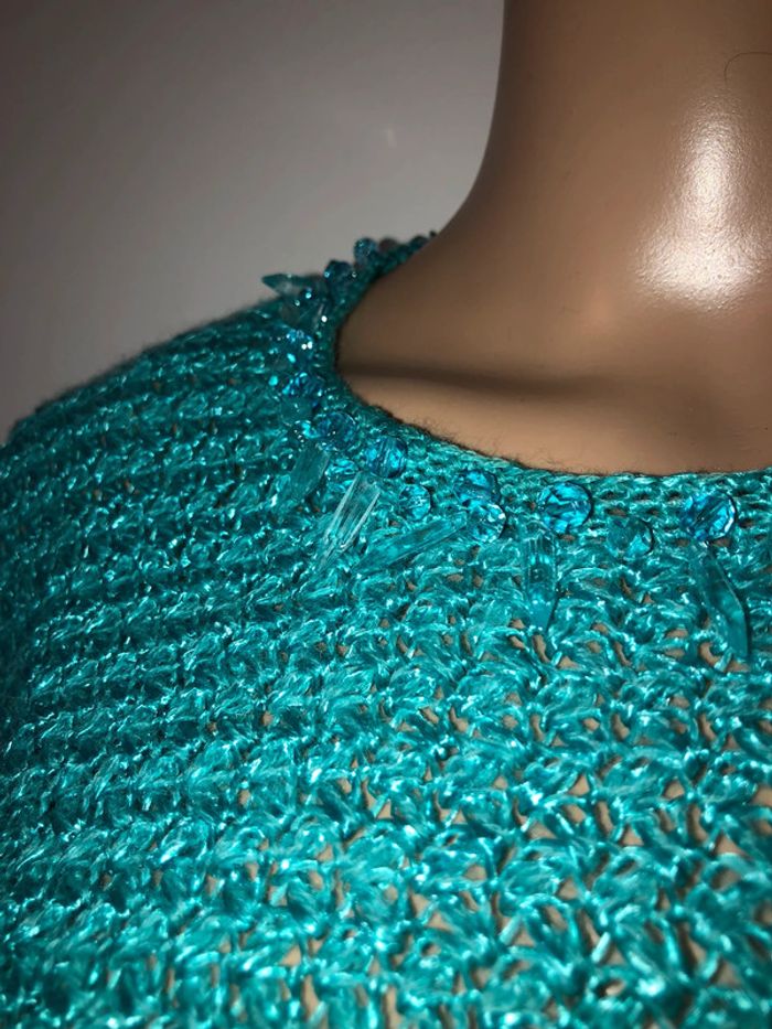 Superbe pull tricoté à la main, couleur turquoise, Encolure et manches perlées
