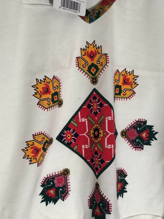 Beau t-shirt blanc Desigual décoré de motifs colorés et lumineux, idéal pour l'été. Jamais porté