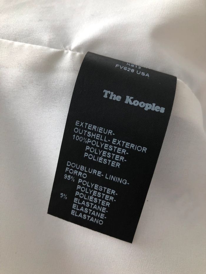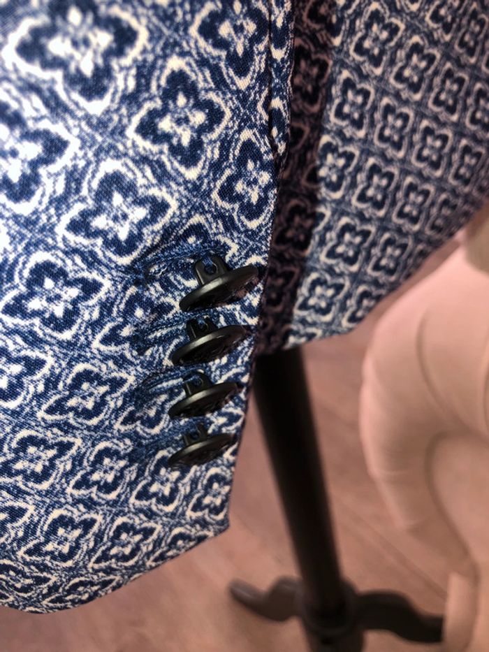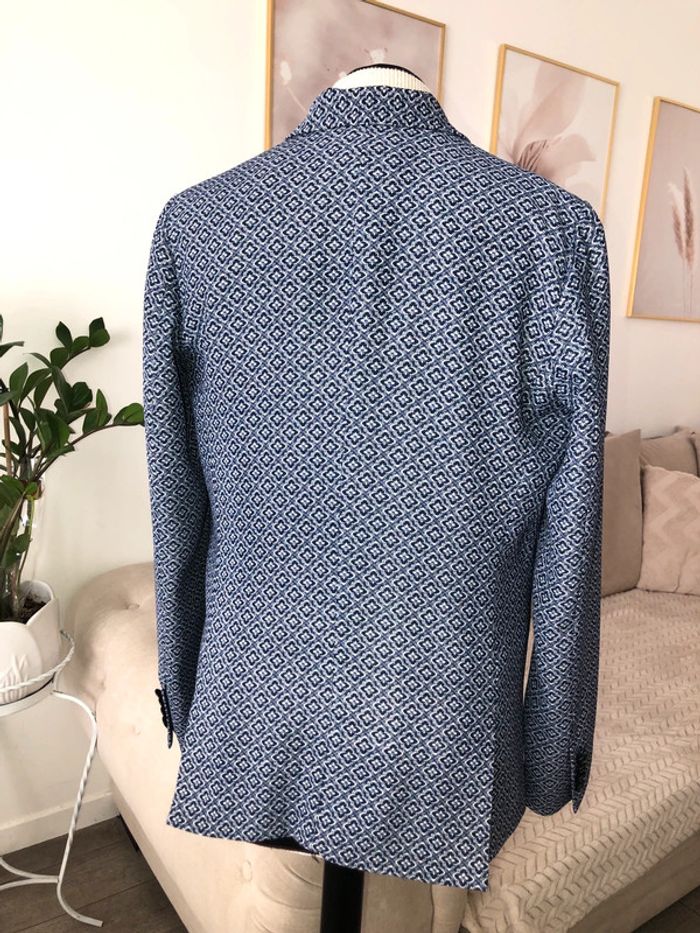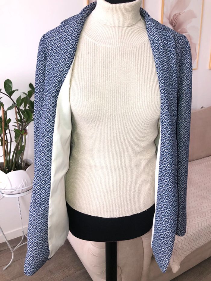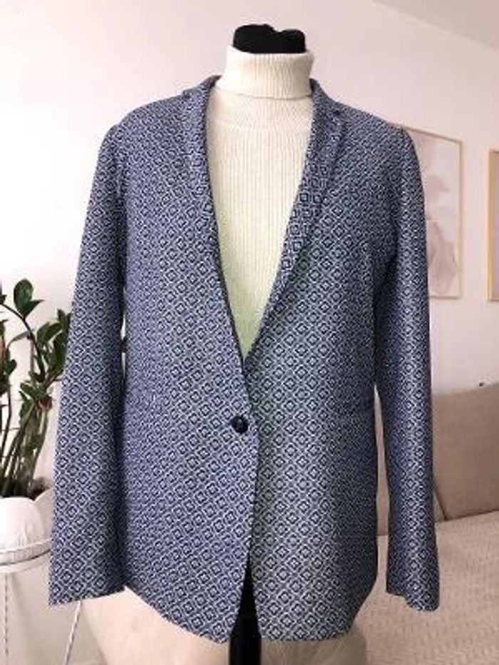 Superbe veste The Kooples à motifs géométriques bleus et blancs. Idéale pour un look tendance et chic. Sort du pressing
