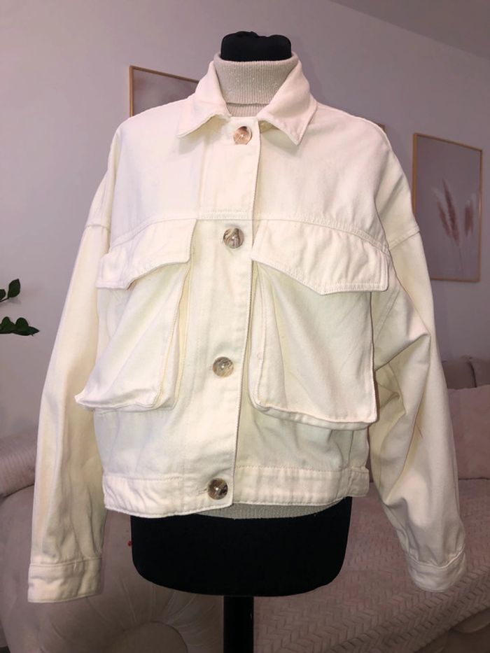 Veste en jean beige élégante, idéale pour toutes saisons. 2 grandes poches sur le devant