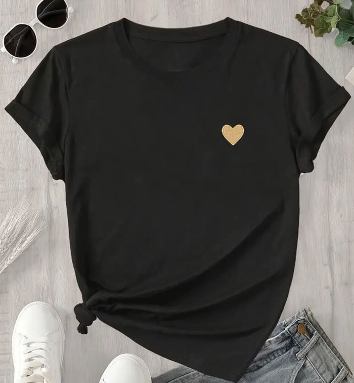 T-shirt noir en coton avec cœur doré, parfait pour un look décontracté.