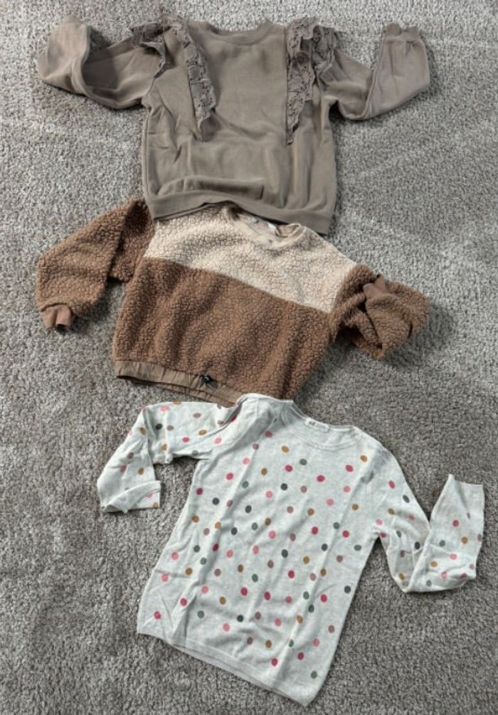 le kaki et le marron son en bon état, le kaki a une petite tache sur le devant mais se voit à peine (voir photo),Le pull avec les petits pois est en très bon état, les 3 pulls viennent de chez H&M #h&m #pullfille #missmadere91_enfant8ans