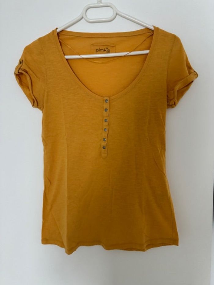 Tee-shirt cintré jaune moutarde en bon état, Petite tache à l’arrière (voir photo) mais rien de méchant. #pimkie #teeshirt #teeshirtpimkie #missmadere_femme38