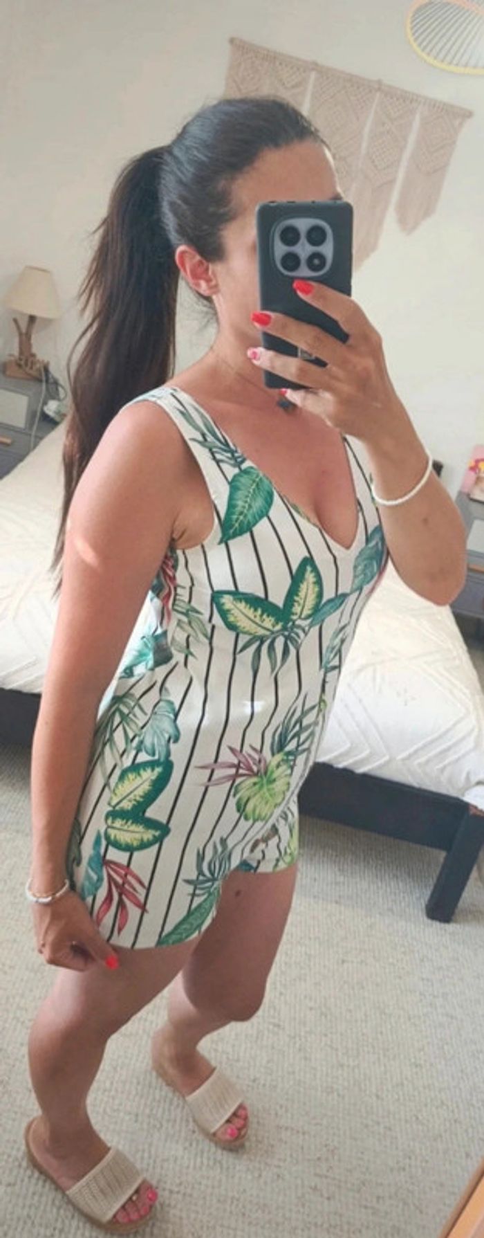 Très bon état. Zip dans le dos. Un indispensable pour cet été 😍. 98% coton et 2% élasthanne. Largeur aisselles : 45 cm. Largeur hanches : 51 cm. Longueur combi : 73 cm. 08/06/25