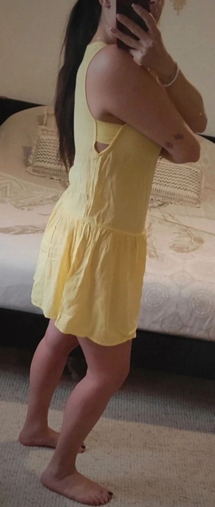 Très bon état. Robe légère, agréable à porter. Détail ajouré sur les côtés. Le haut est censé être moins tendu que sur les photos car je fais un M mais au moins cela vous donne une idée de la robe portée. Largeur aisselles : 46 cm. Longueur robe : 87 cm. 16/02/25