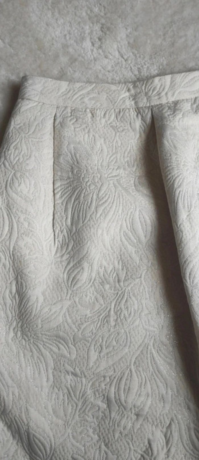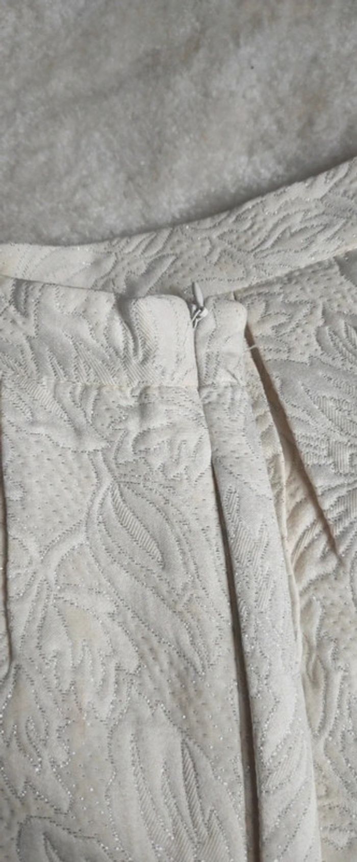 Très bon état. Fermeture zip sur le côté. Avec 2 poches. Coton, polyester et fibres métallisées. Avec doublure. Beau tissu épais effet matelassé. Largeur taille : 37 cm. Longueur jupe : 47 cm. 06/04/25