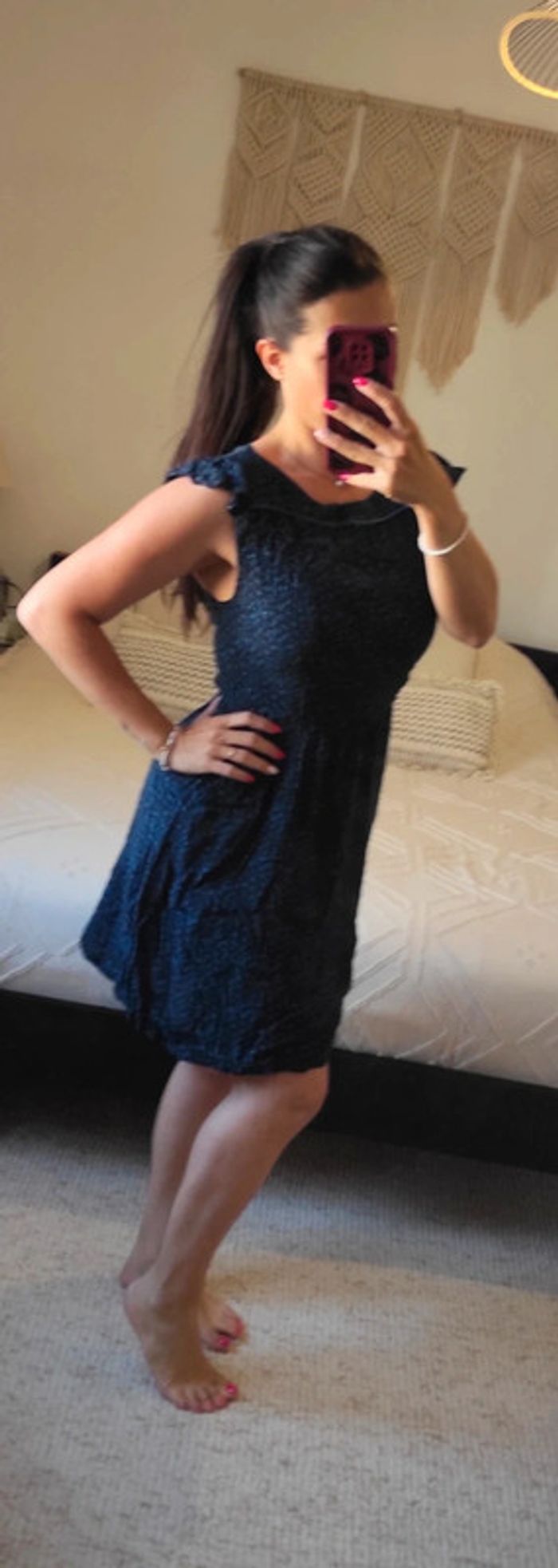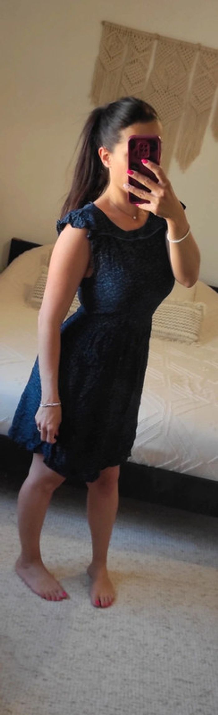 Très bon état. Zip dans le dos. Avec doublure. 100% viscose. Cintrée, fait une jolie silhouette. Largeur aisselles : 45 cm (s'étire jusqu'à 50 cm). Longueur robe : 92 cm. 18/05/25