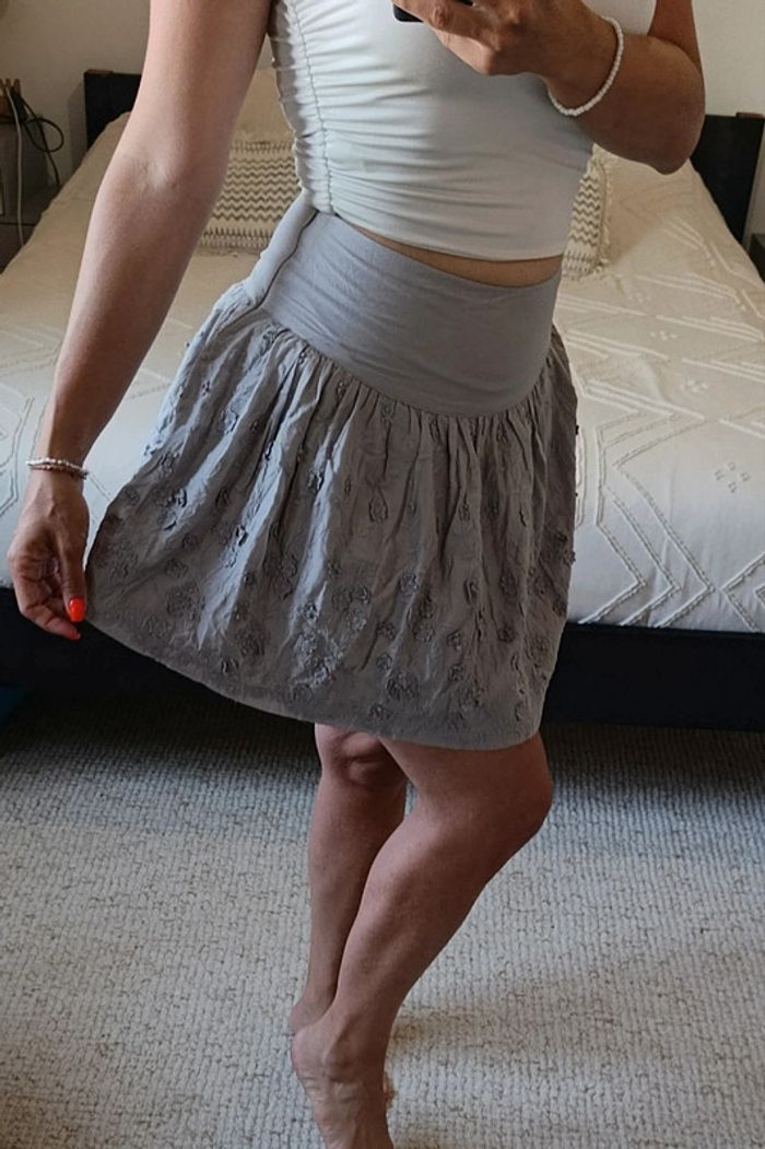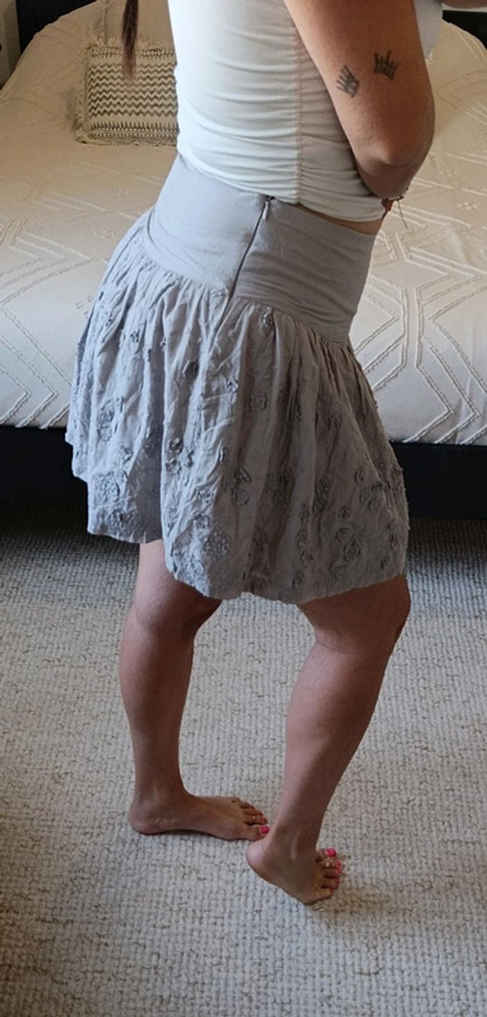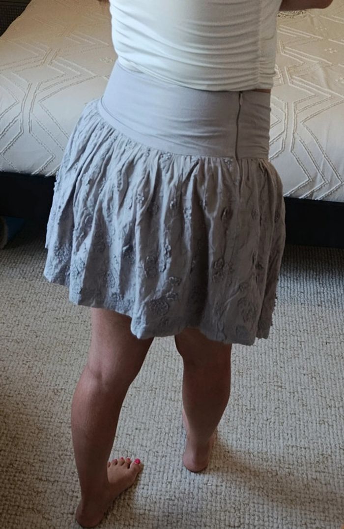 Très bon état. Zip sur le côté. Légère tâche à côté de la fermeture éclair mais rien de bien méchant. Avec doublure. Largeur taille : 37 cm. Longueur jupe : 41 cm. 08/06/25