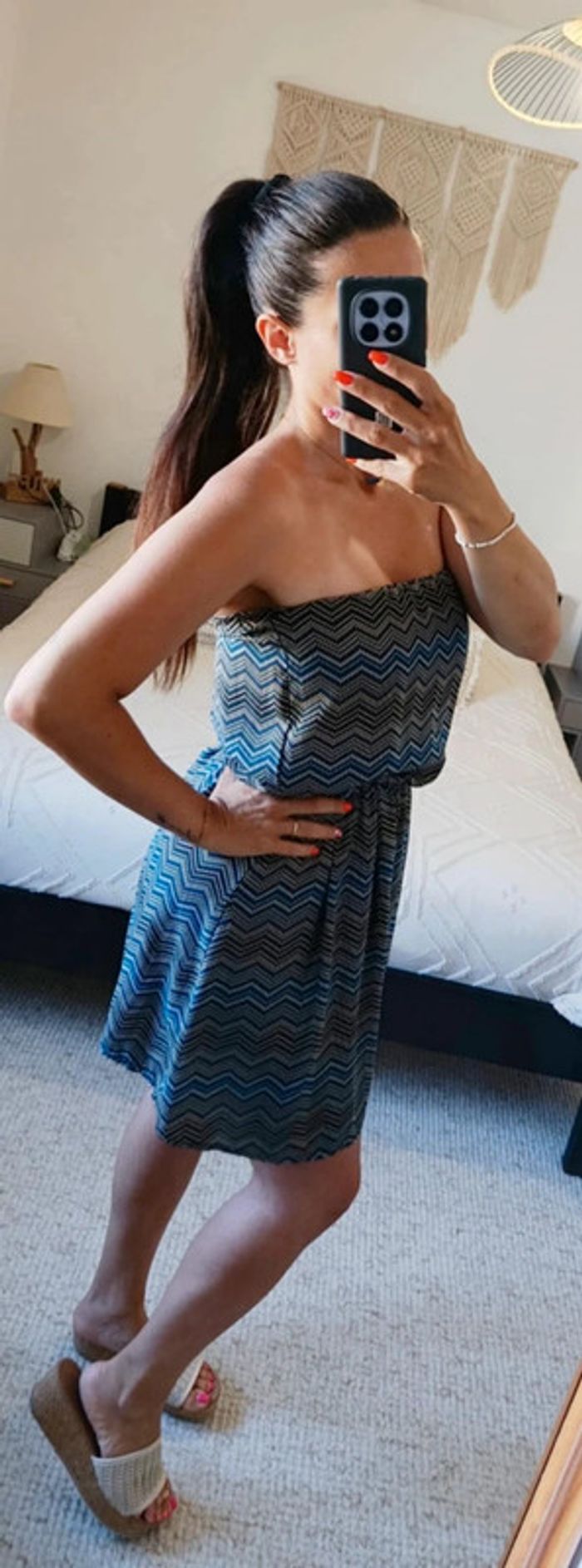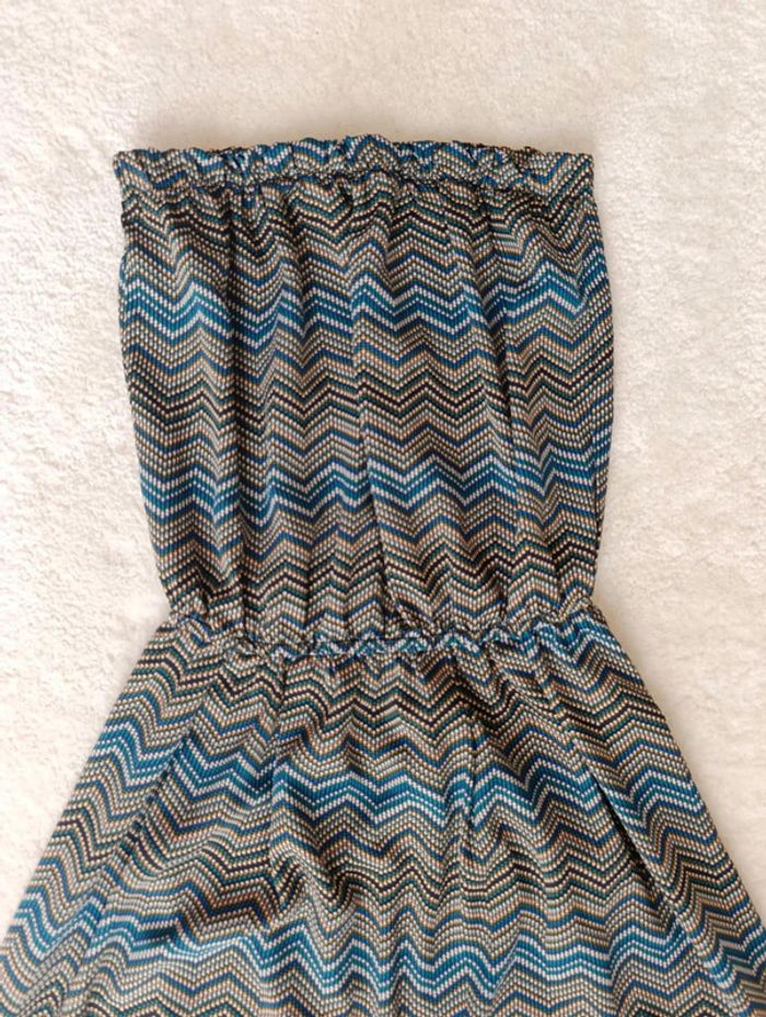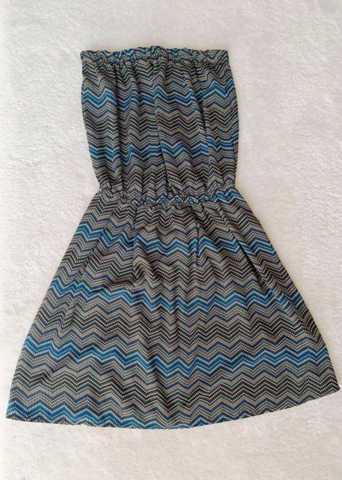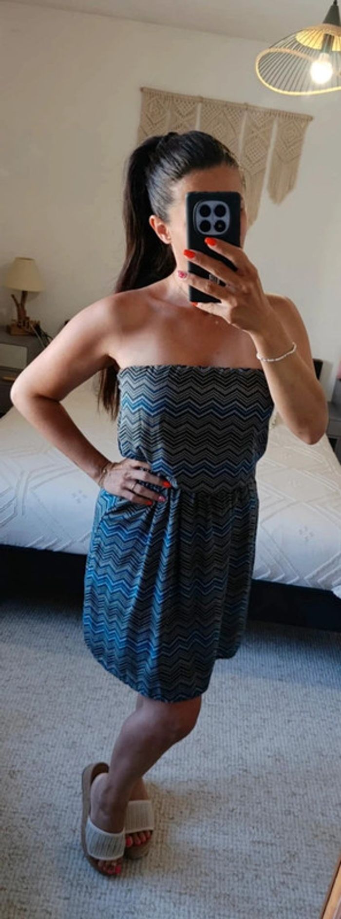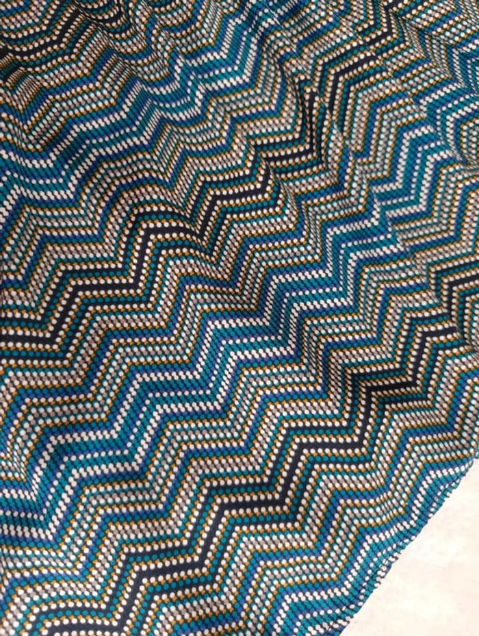 Très bon état, comme neuve. Motif chevrons. Taille élastique. 100% viscose. Largeur aisselles : 34 cm (s'étire jusqu'à 45 cm). Largeur taille : 30 cm (s'étire jusqu'à 43 cm). Longueur robe : 74 cm. 15/06/25