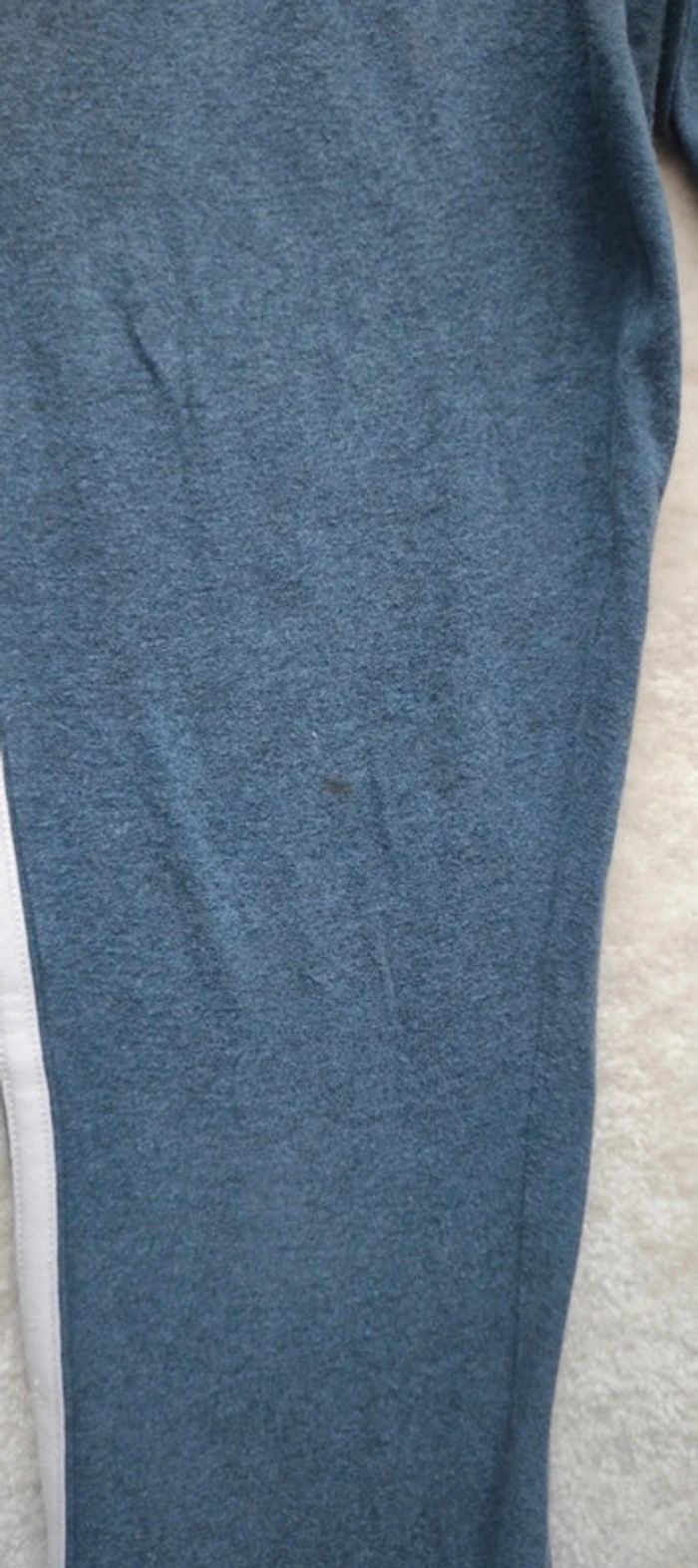 Porté mais encore en bon état. Petite tâche sur la cuisse droite (voir photo 5). Taille élastique. Coton et élasthanne. Largeur taille : 32 cm (s'étire jusqu'à 51 cm). Longueur entre jambes : 73 cm. Longueur totale pantalon : 87 cm.