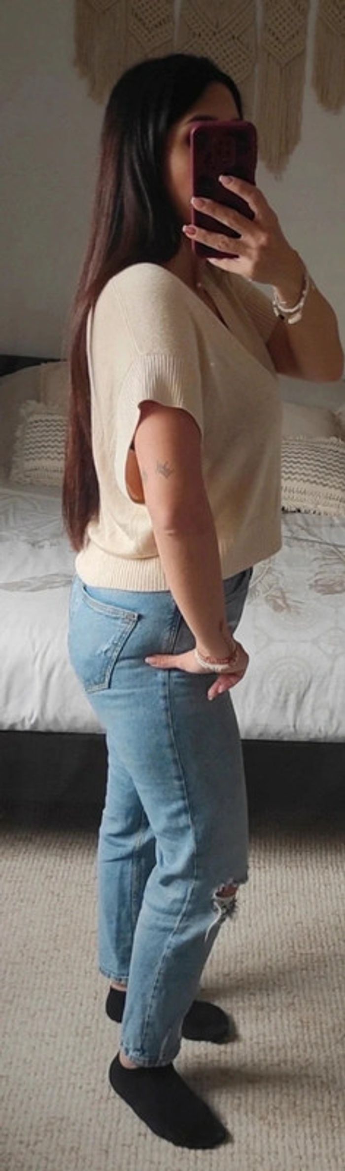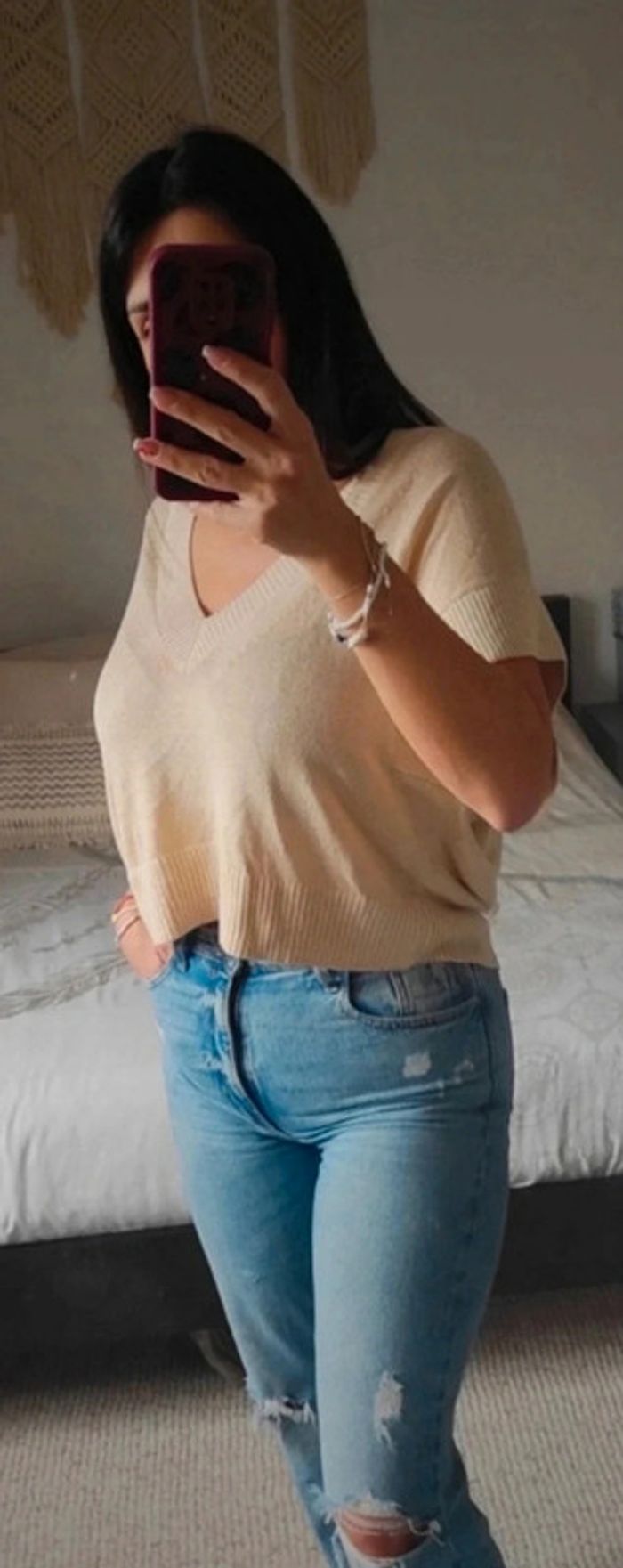 Neuf avec étiquette (l'étiquette est déchirée mais on voit encore le prix, 59,99€). Beige avec fil doré. Manches courtes. Style croc top. 09/02/25