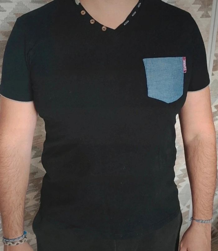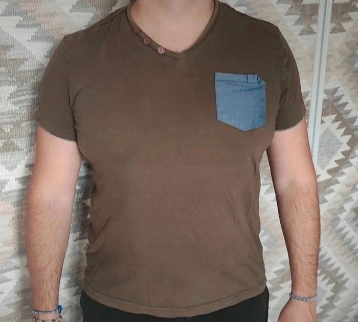 Très bon état. Poche couleur jean. Col V. Boutons sur le col. Peuvent convenir pour un M.