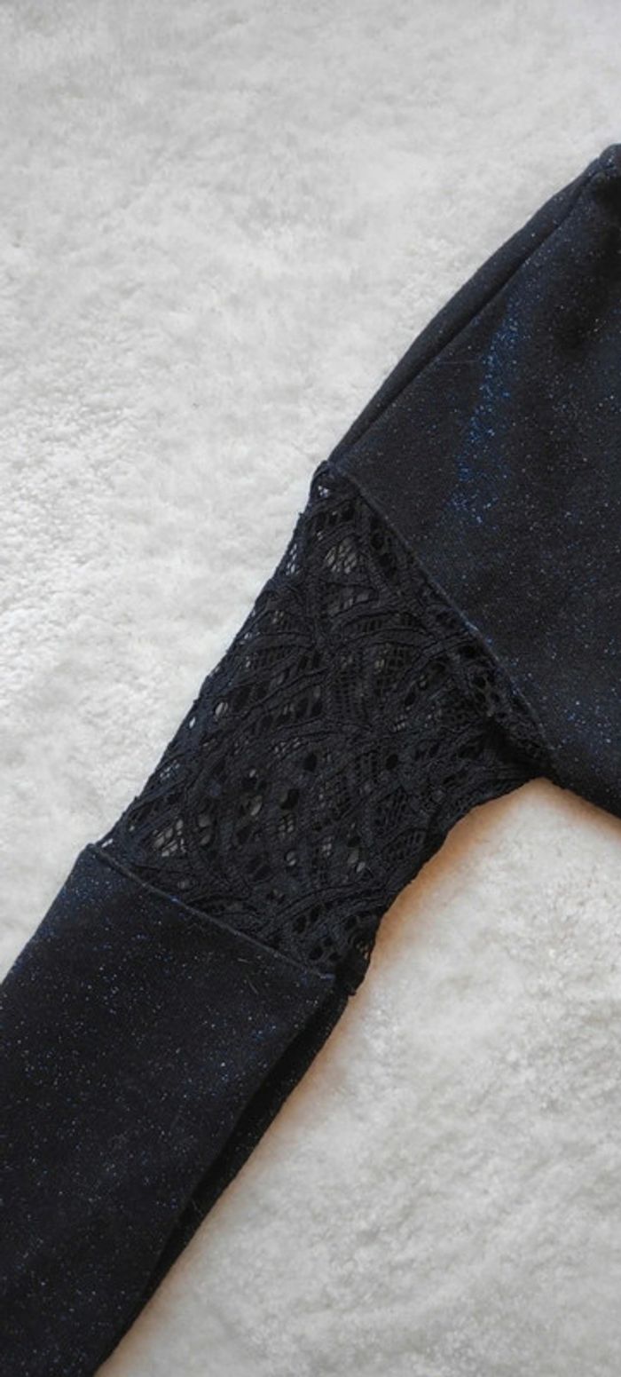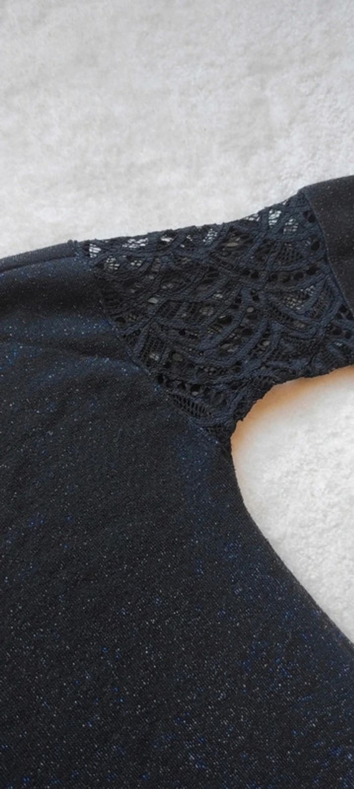 Très bon état. Col rond. Détail dentelle ajourée sur chaque Manche. Paillette bleu gris. Coton, polyester et viscose. Largeur aisselles : 46 cm. Longueur pull : 55 cm. 09/02/25