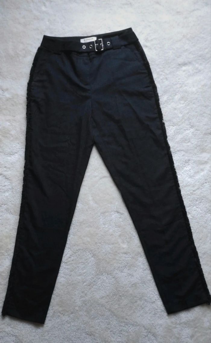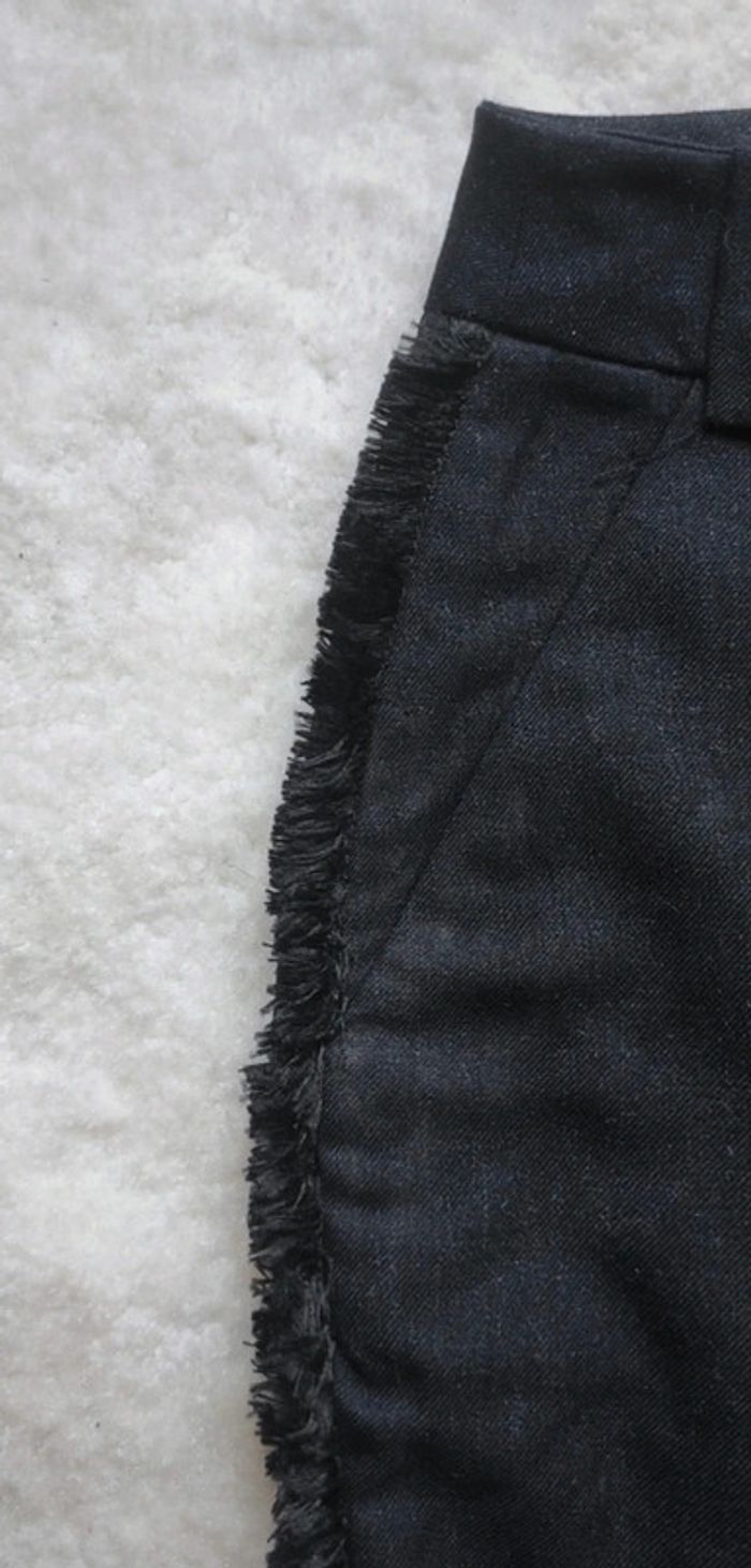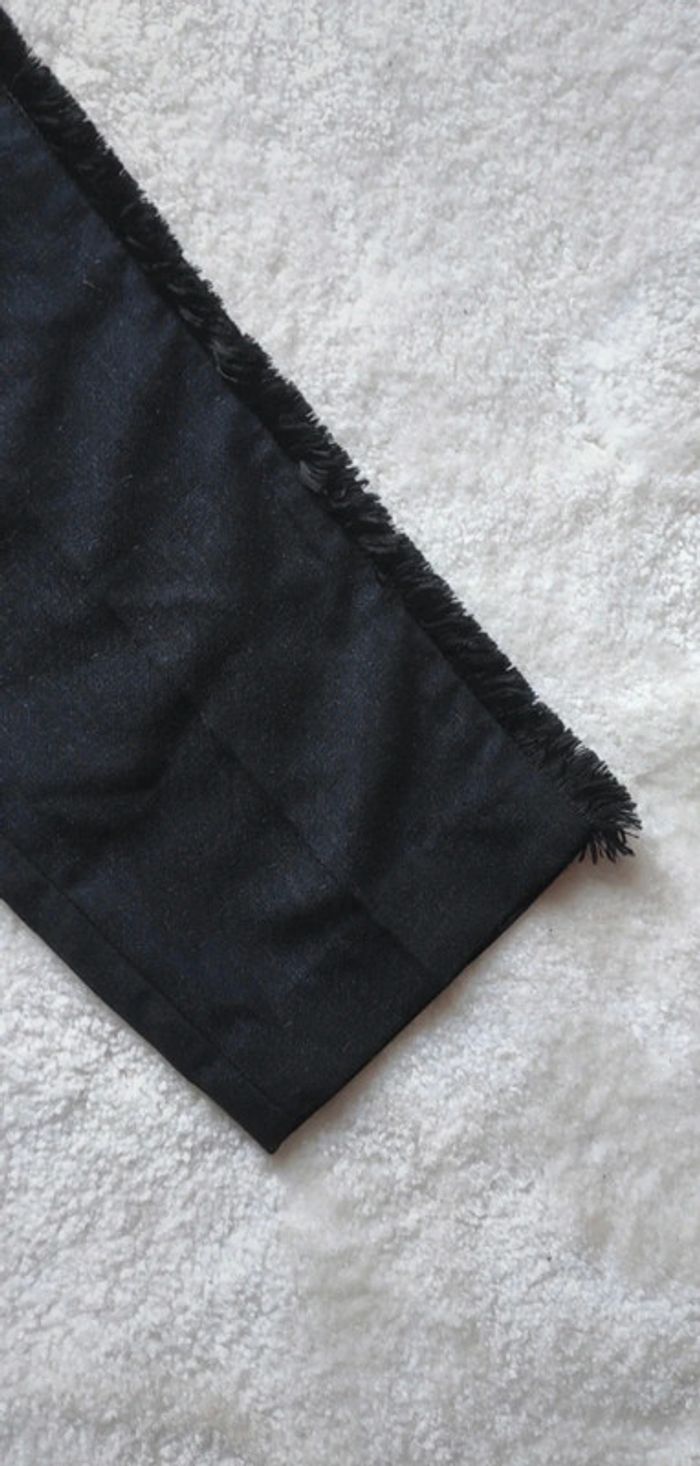 Très bon état. Style pantalon de costume, pantalon à pince. Avec ceinture intégrée. Tissu chiné. Petite frange de poils noirs tout le long des 2 jambes sur le côté. Largeur taille : 33 cm. Longueur entre jambes : 72 cm. Longueur totale pantalon : 97 cm. 26/01/25