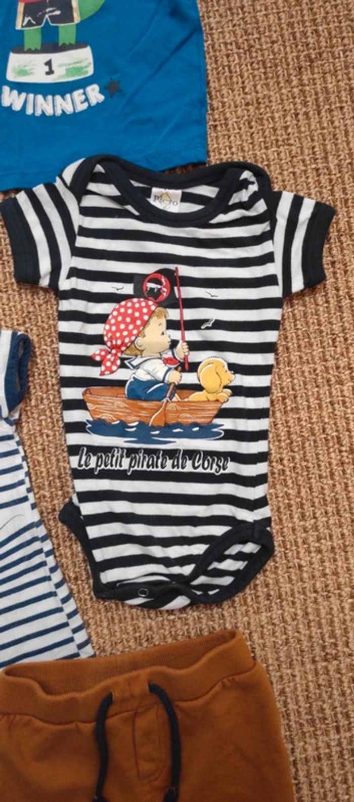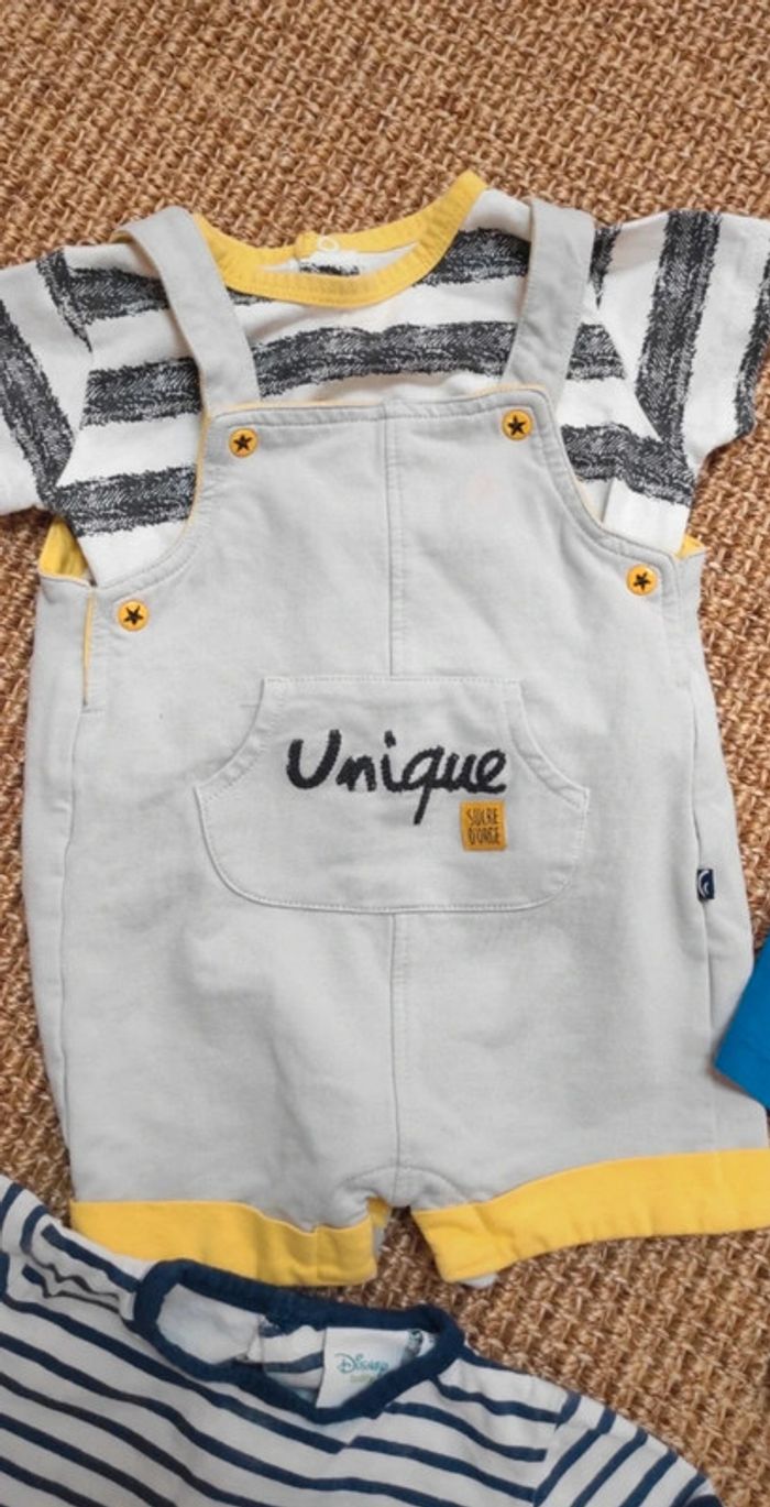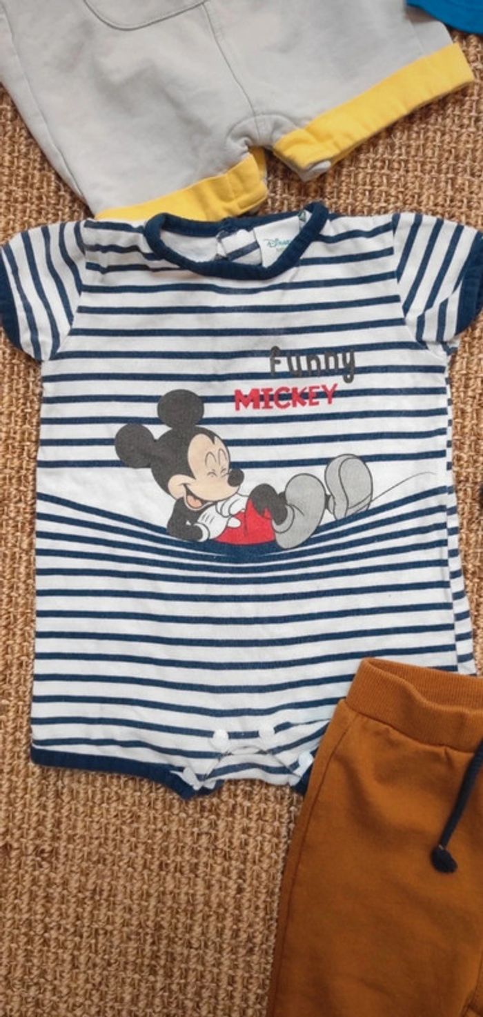 Porté mais encore en bon état. Un pantalon, un body matin/pirate, une combishort Mickey/Disney, un t-shirt crocodile et un ensemble salopette avec t-shirt sucre d'orge.