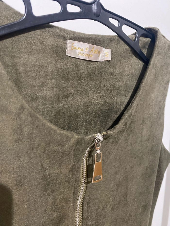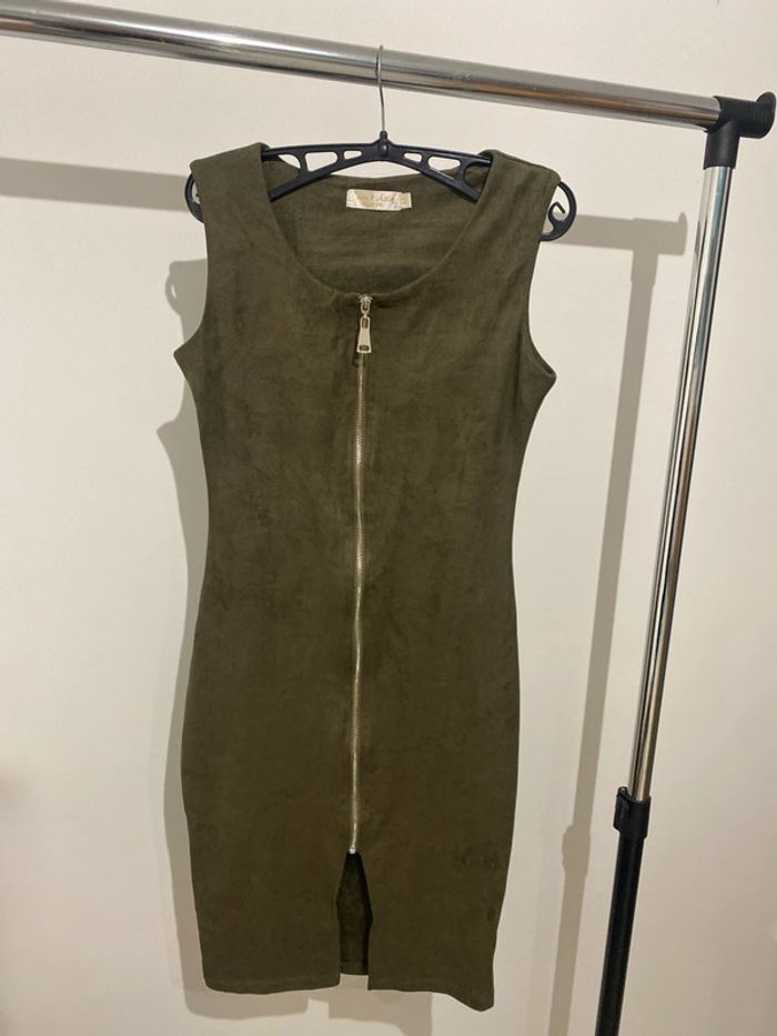 Robe près du corps, couleur marron/kaki taille M Matière un peu épaisse aspect proche du velours Décolleté ajustable avec la fermeture éclair Largeur au niveau des épaules, environ 38 cm Longueur environ 96 cm Largeur au niveau des hanches, environ 38 cm Largeur sous les aisselles, environ 44 cm #femmexav