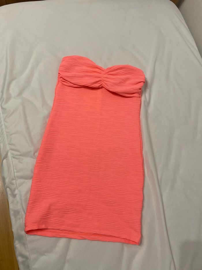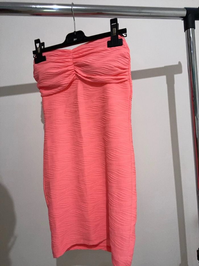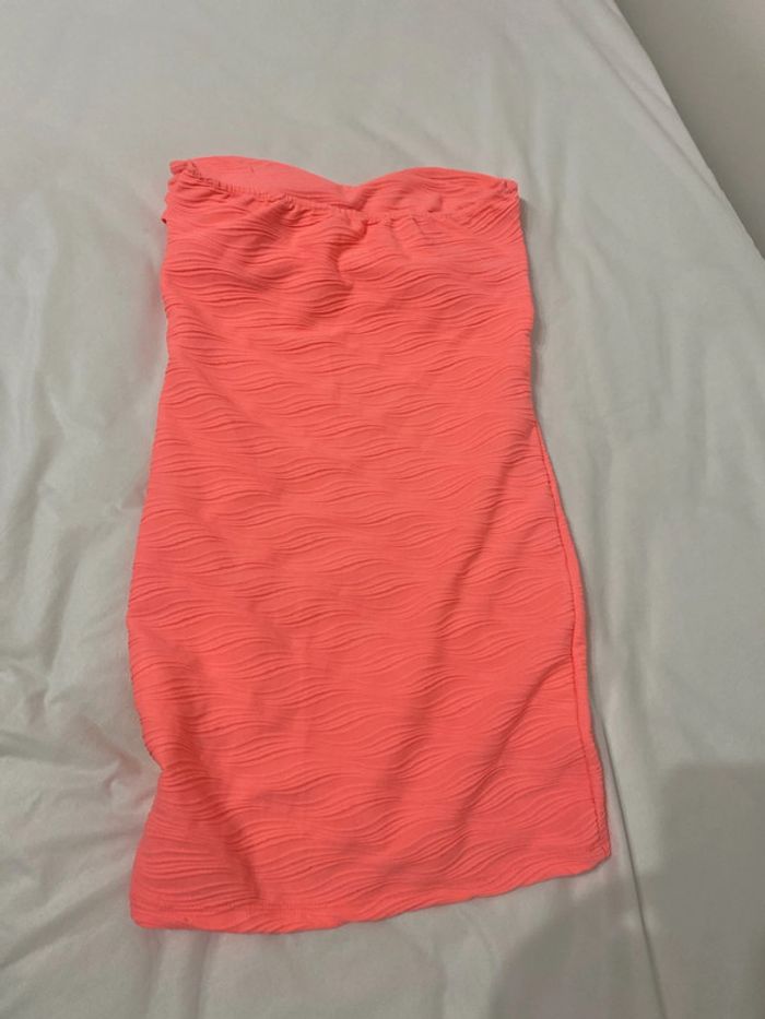 Robe bustier, moulante, couleur rose fluo La couleur ne ressort pas bien sur les photos car sur les photos on aurait tendance à croire à du corail, mais c’est bien en rose fluo La robe mesure environ 62,5 cm de long Largeur sous aisselles environ 37 cm, largeur sous poitrine environ 33 cm Robe en matière extensible, 100 % polyester #femmexav