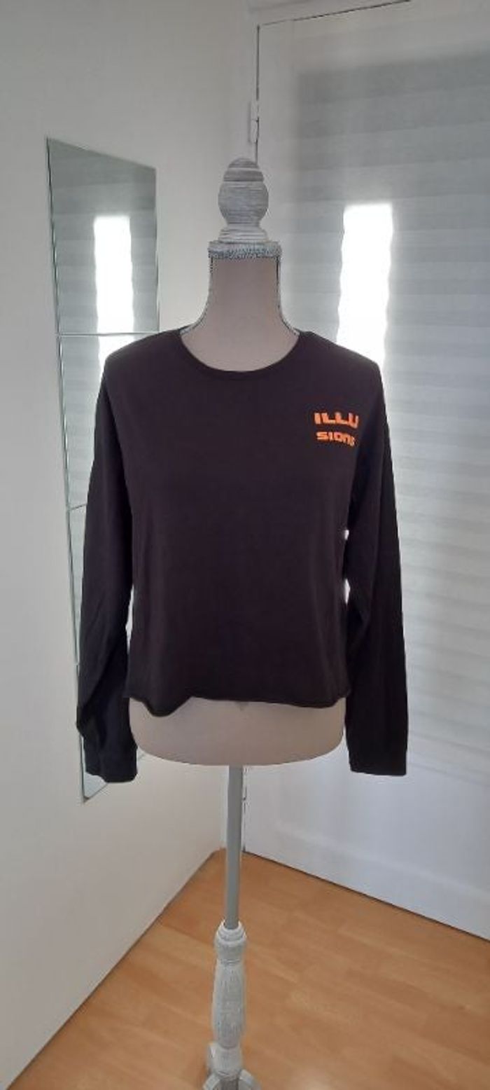 Sweat noir "FB Sister" de taille XL manches longues 100% coton, print "illusions" couleur orange sur le devant et grand print derrière. Longueur du sweat 47cm .. en très bon état.
