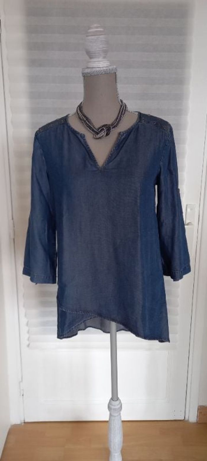 Blouse bleu jean "Picadilly" taille XS convient aussi pour un S large en matière 100% Lyocell. Manches 3/4, col V, joli croisé en bas de la blouse. Elle est courte devant (65cm de long) et beaucoup plus longue à l'arrière (82cm de long), des œillets métalliques argentés sur les épaules. Neuf sans étiquette jamais porté.