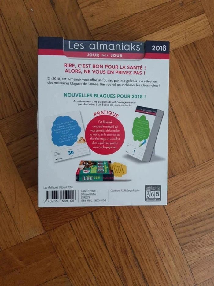 Les meilleurs blagues 2018 Neuf sous blister Rire, c'est bon pour la santé ! Alors, ne vous en privez pas ! En 2018, cet Almaniak vous offre un fou rire par jour grâce à une sélection des meilleures blagues de l'année. Rien de tel pour chasser les idées noires ! Nouvelles blagues pour 2018 ! Avertissement : les blagues de cet ouvrage ne sont pas destinées à un public de jeunes enfants. Pratique Cet Almaniak comprend un support qui vous permettra de l'accrocher au mur ou de le poser sur son chevalet intégré et un coffret dans lequel vous pourrez conserver les pages lues. 9782351559109 #jouetscatalina8