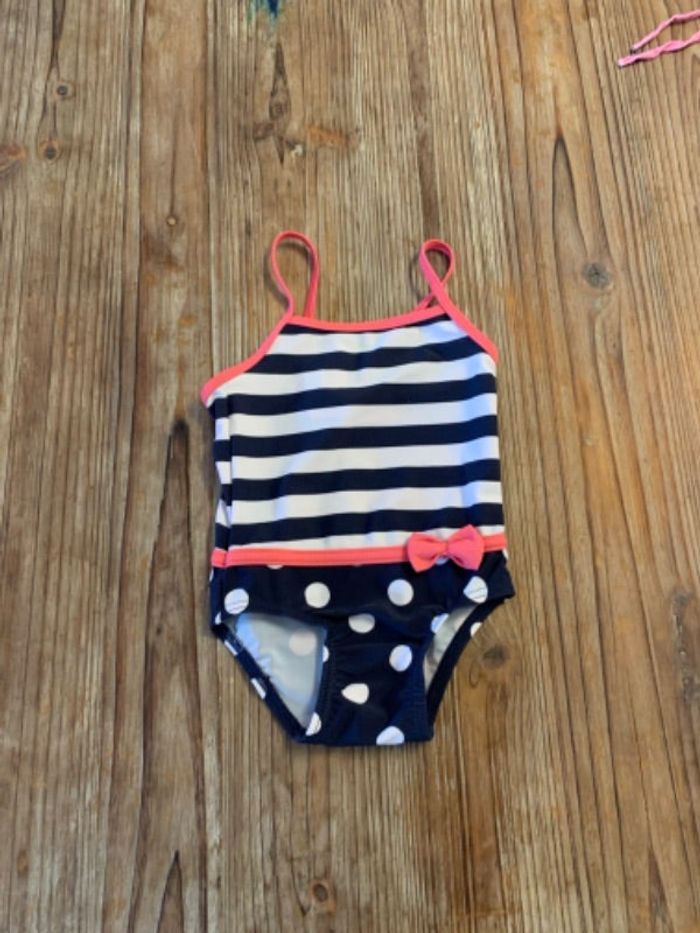 Jolie maillot de bain bébé fille 12 mois Kiabi Blanc et marine (rayures et pois) et rose avec noeud #bebe12mois #bébéfille12mois #maillotbain12mois #maillotbain1pièce #kiabi #kiabi12mois #marinière #pois #noeudrose