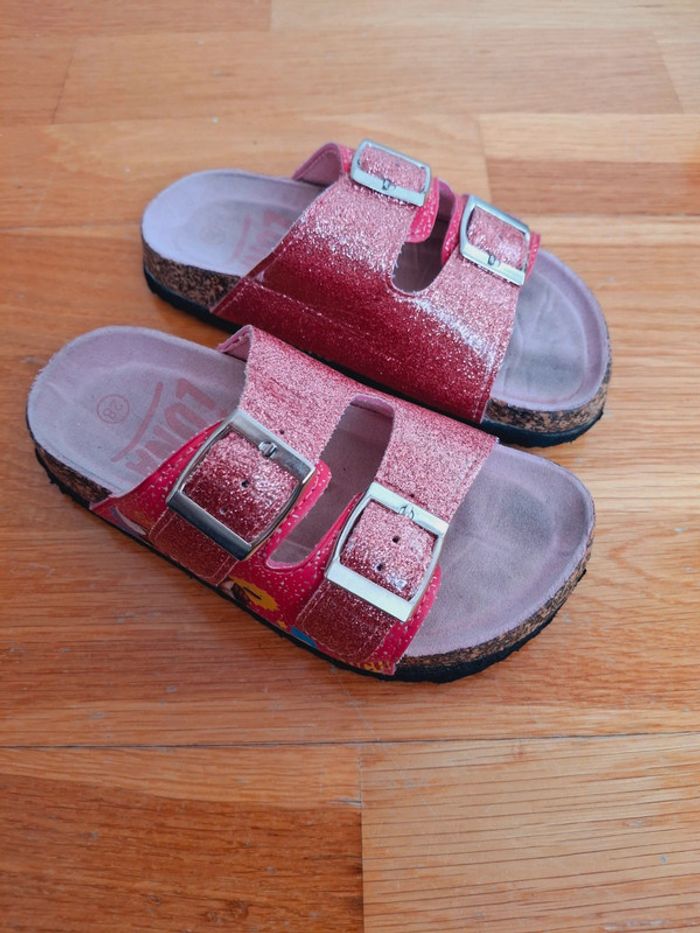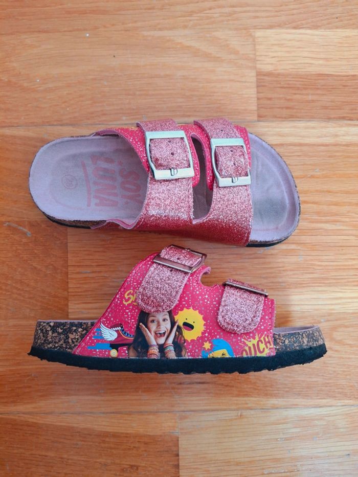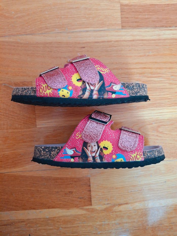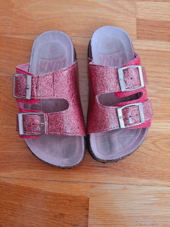 Mules claquettes avec semelles en liège Soy Luna Larges Brides à boucles ajustables Soy Luna Pointure 28 Rose fuschia à paillettes La semelle intérieure a été nettoyée mais il reste des traces sur les points d'appui qui ne se voient pas lorsque la chaussure est portée Très bon état #adelaide7624chaussuresfille28