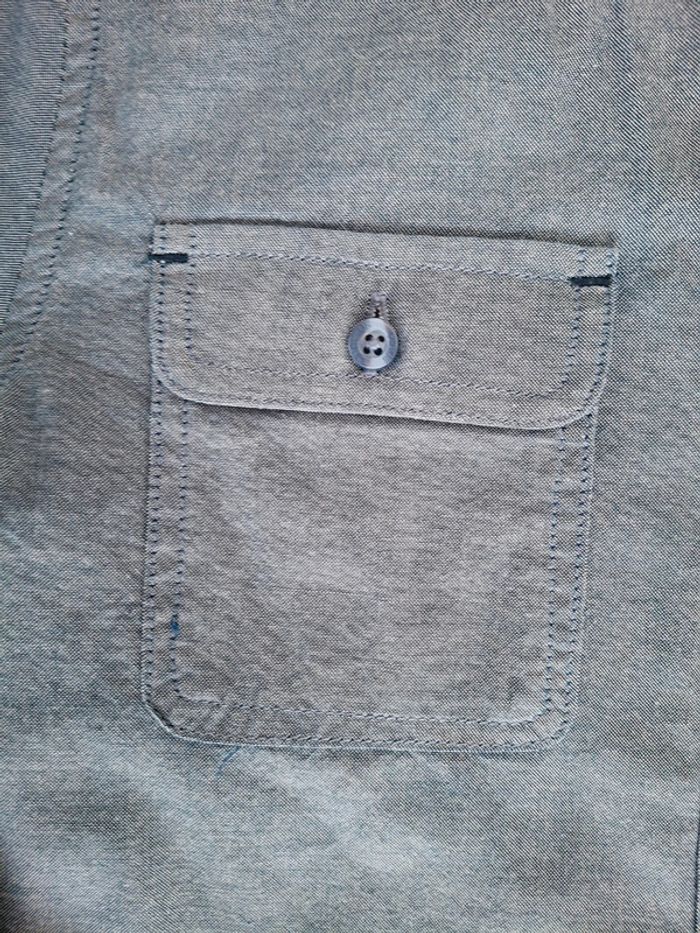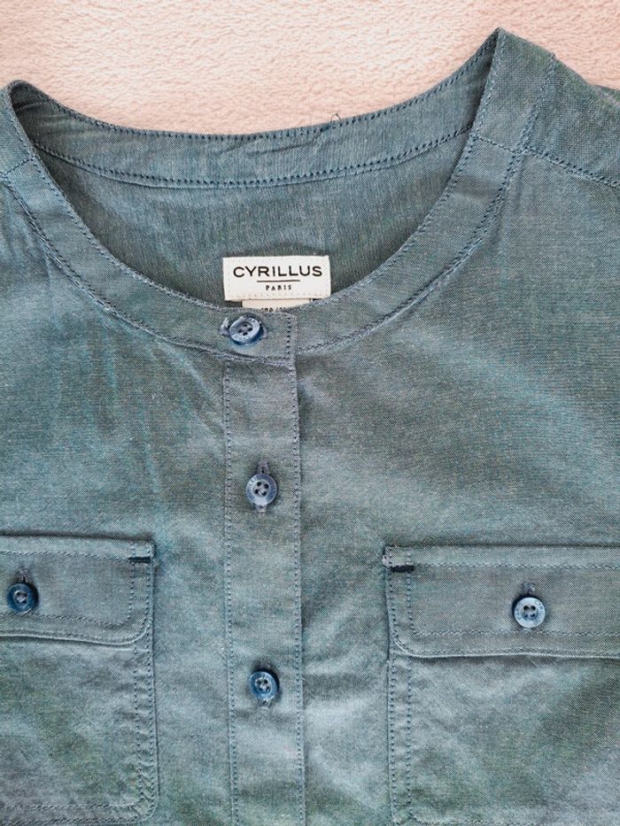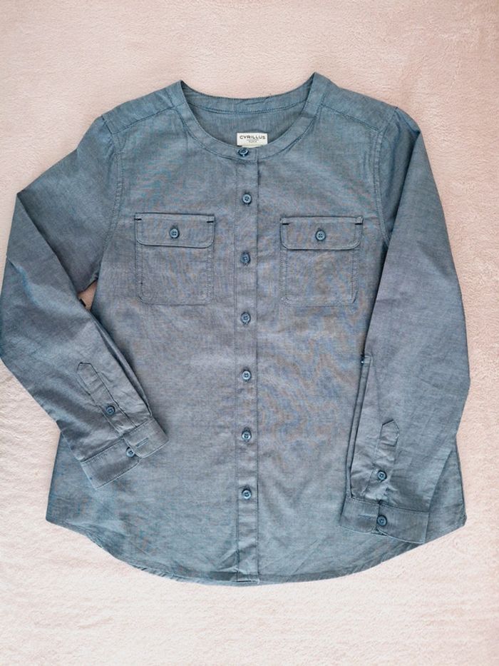 Chemisier tunique Cyrillus sans col 10 ans bleu chambray manches longues retroussables