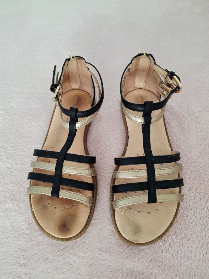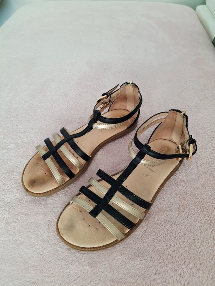 Sandales Geox modèle Karly pointure 33 Noir et doré Matériau de la semelle : Caoutchouc Matériau extérieur : Cuir Fermeture éclair a l'arrière de la chaussure pour ne pas avoir à enlever les boucles La couleur de la semelle intérieur est un peu partie sur les points au niveau du talon et des doigts de pieds mais elles sont en très bon état #adelaide7624chaussuresfille33