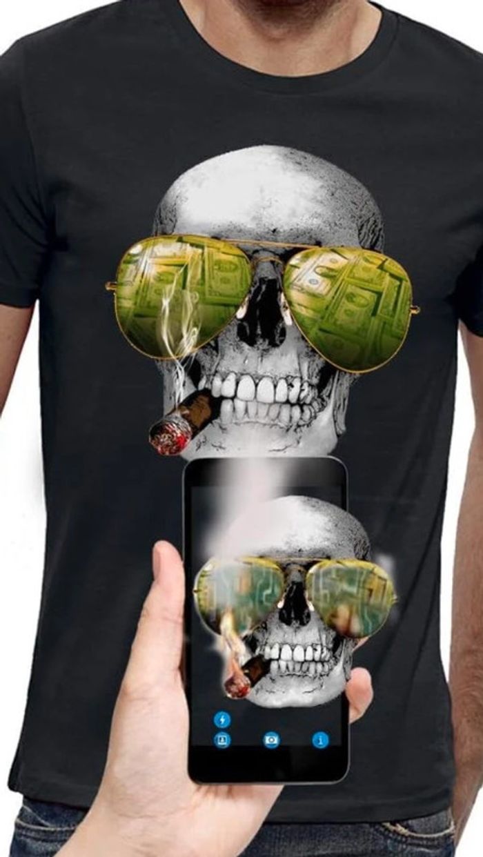 En parfait état T-shirt 3D animé CRÂNE CIGARE ET LUNETTE DE SOLEIL + application gratuite. Découvrez la Réalité Augmentée ! Téléchargez gratuitement l'application PIXEL EVOLUTION AR. Ouvrez l’application, placez votre smartphone devant le dessin et découvrez l'animation 3D correspondante ! #pixel #misspaule_garcon12ans