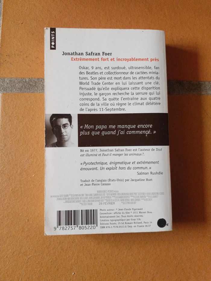 Extrêmement fort et incroyablement près de Jonathan Safran Foer Livre de poche adapté ai cinéma avec Tom Hanks et Sandra Bullock C29