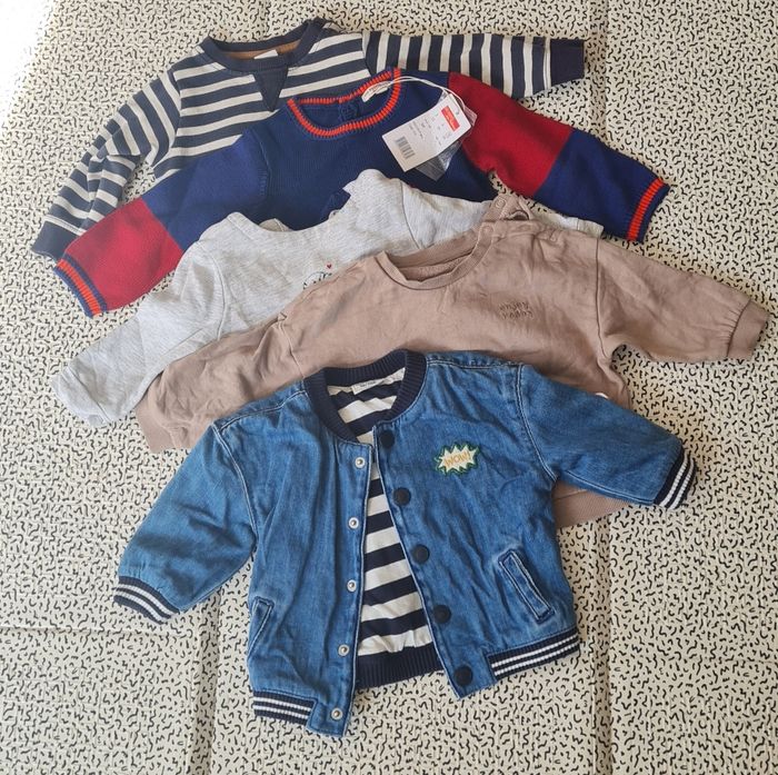 Lot de 9 mois garçon, 4 pulls, 1 veste effet jean, 3 t shirts à manches longues