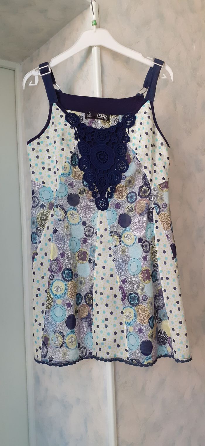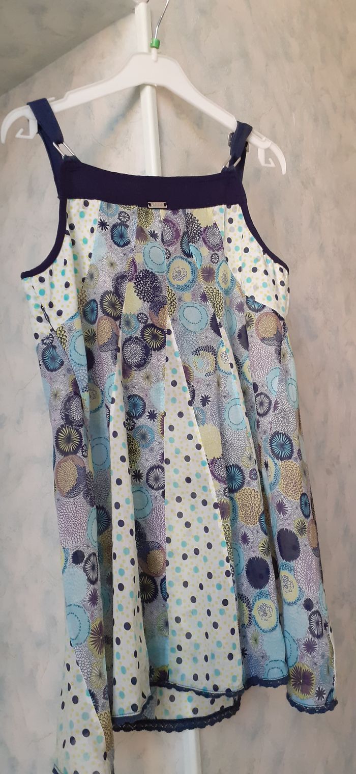 Vends une tunique à bretelles réglables, 100 % coton, transparente, forme trapèze, motifs dans les tons de bleu et broderies bleu marine sur le buste, marque Top Prunelle, taille 2 sur l'étiquette, 38 Longueur sous aisselle : 58 cm Largeur aisselle à aisselle : 45 cm.